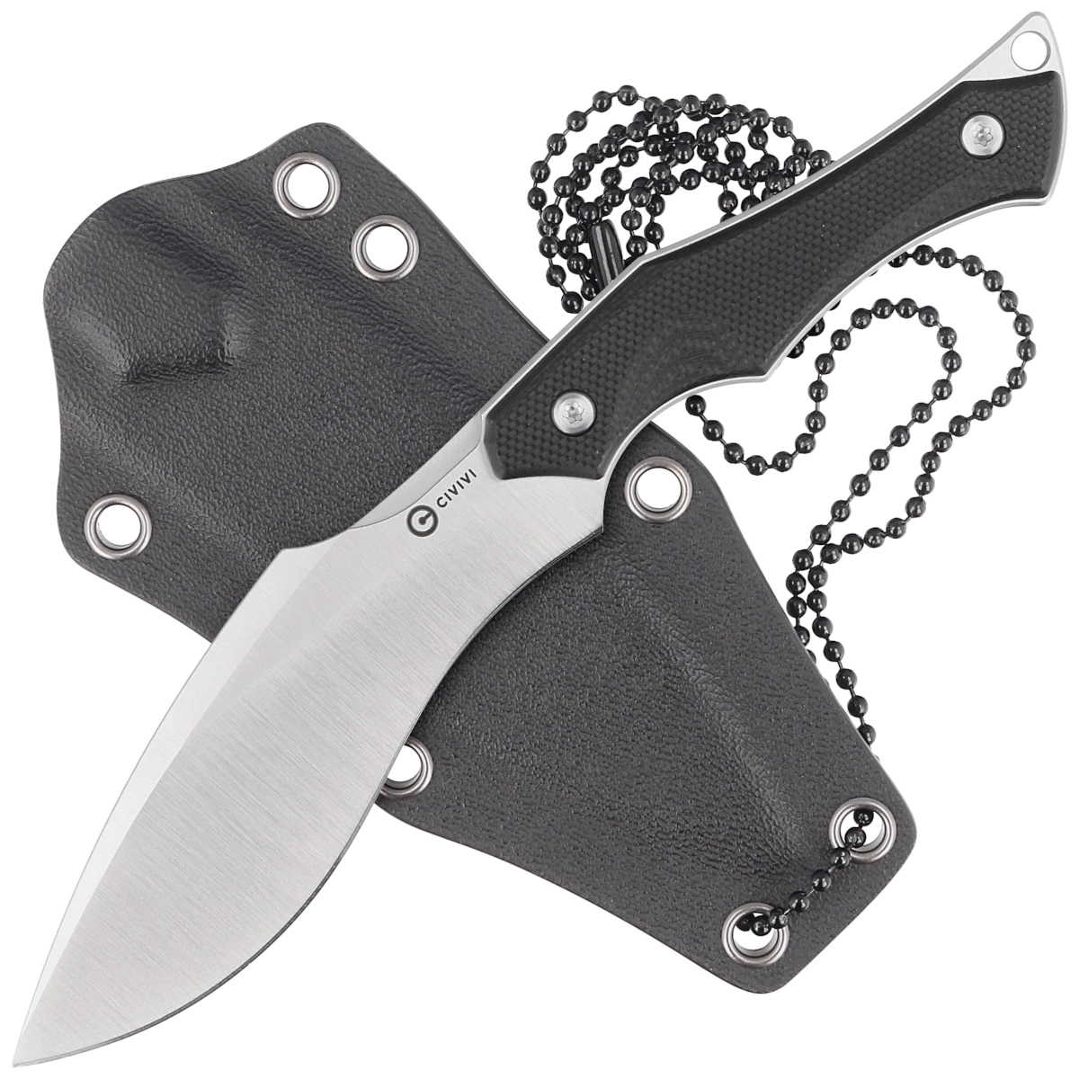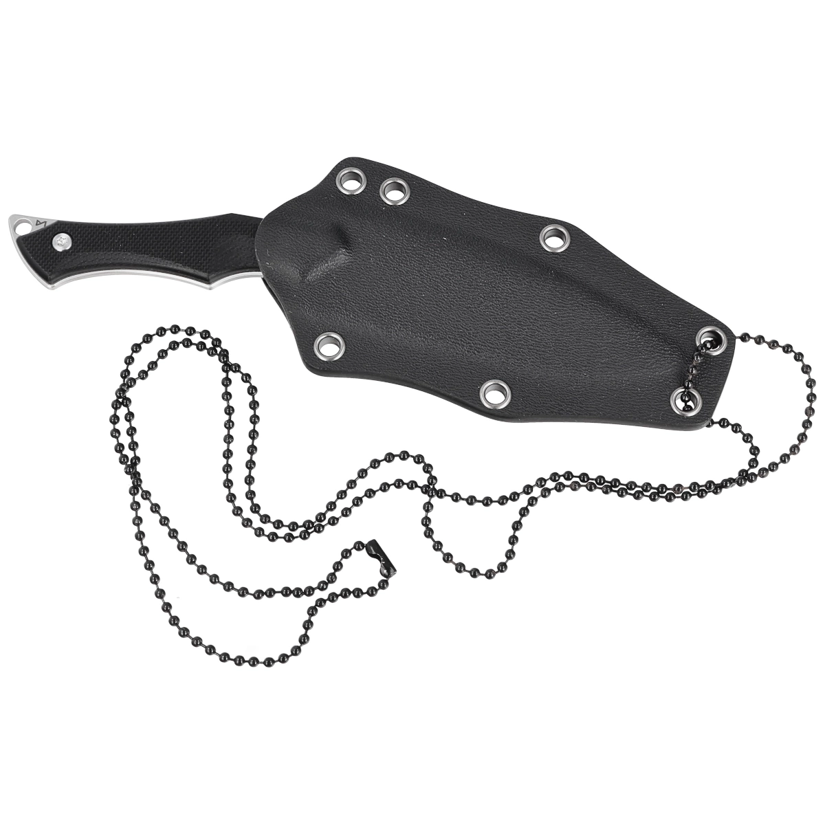 Sheath - made of kydex, extended, protecting the Blade along with part of the Handle. A set of holes on the edges provides multiple trouncing options. Complete with a ball chain for hanging the knife around the neck.