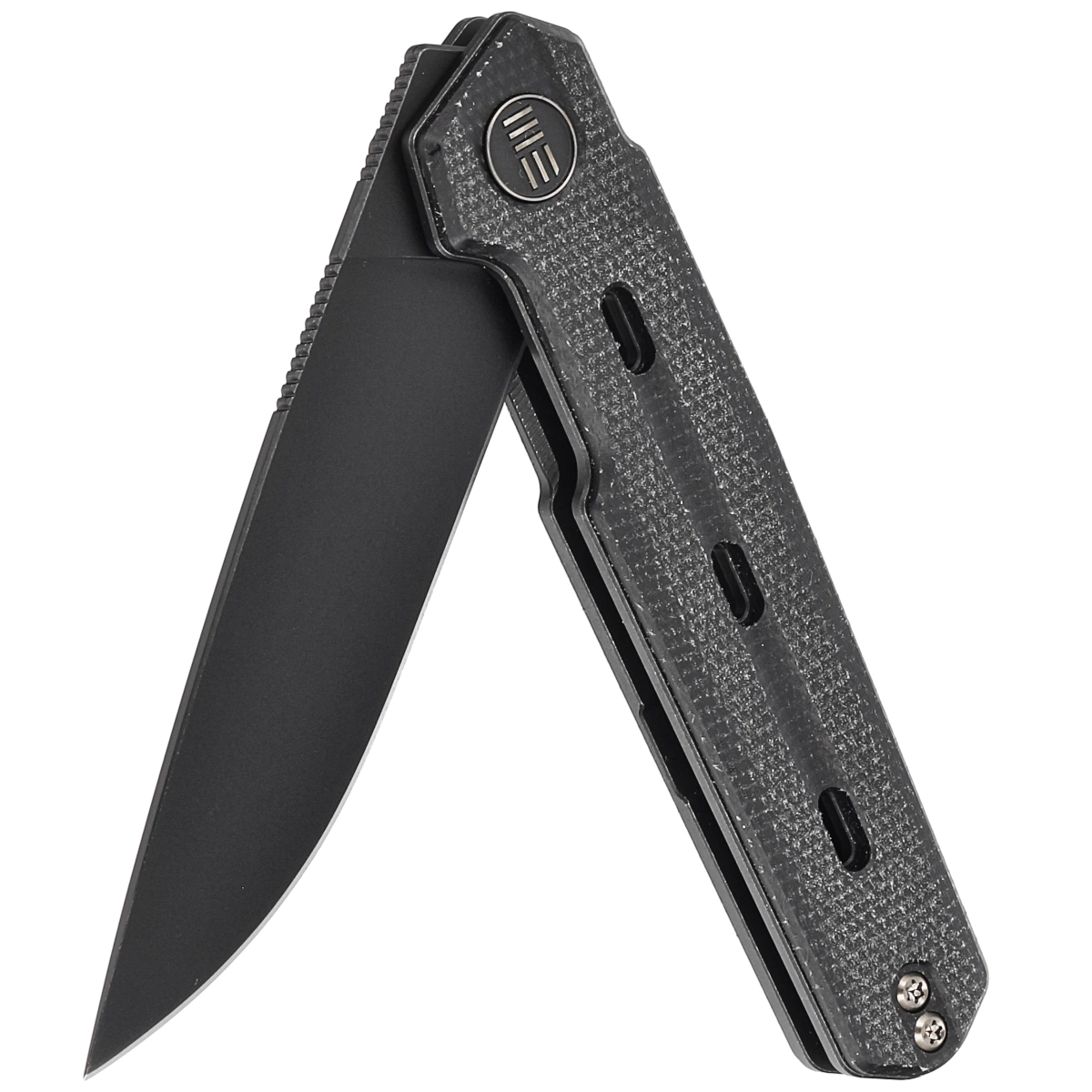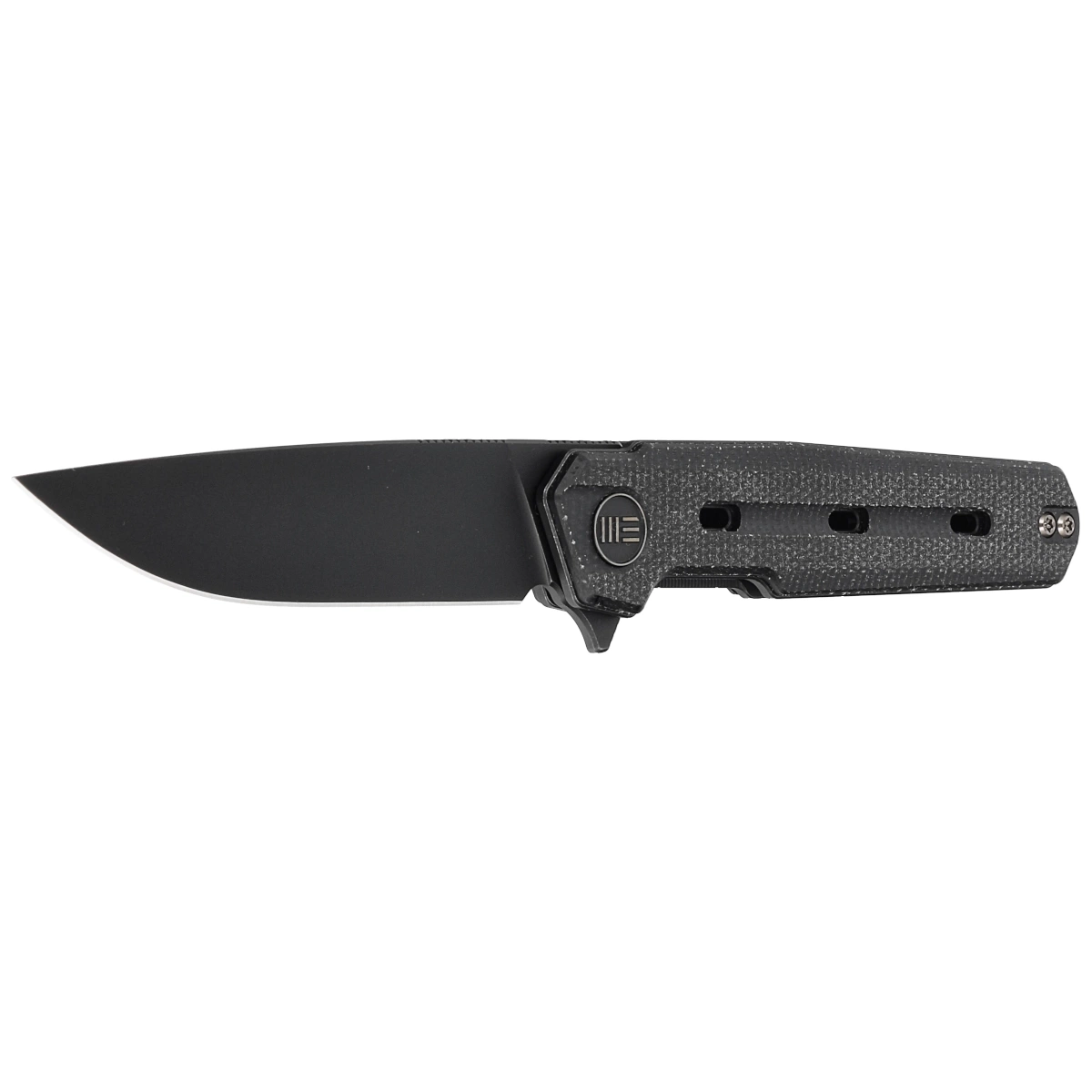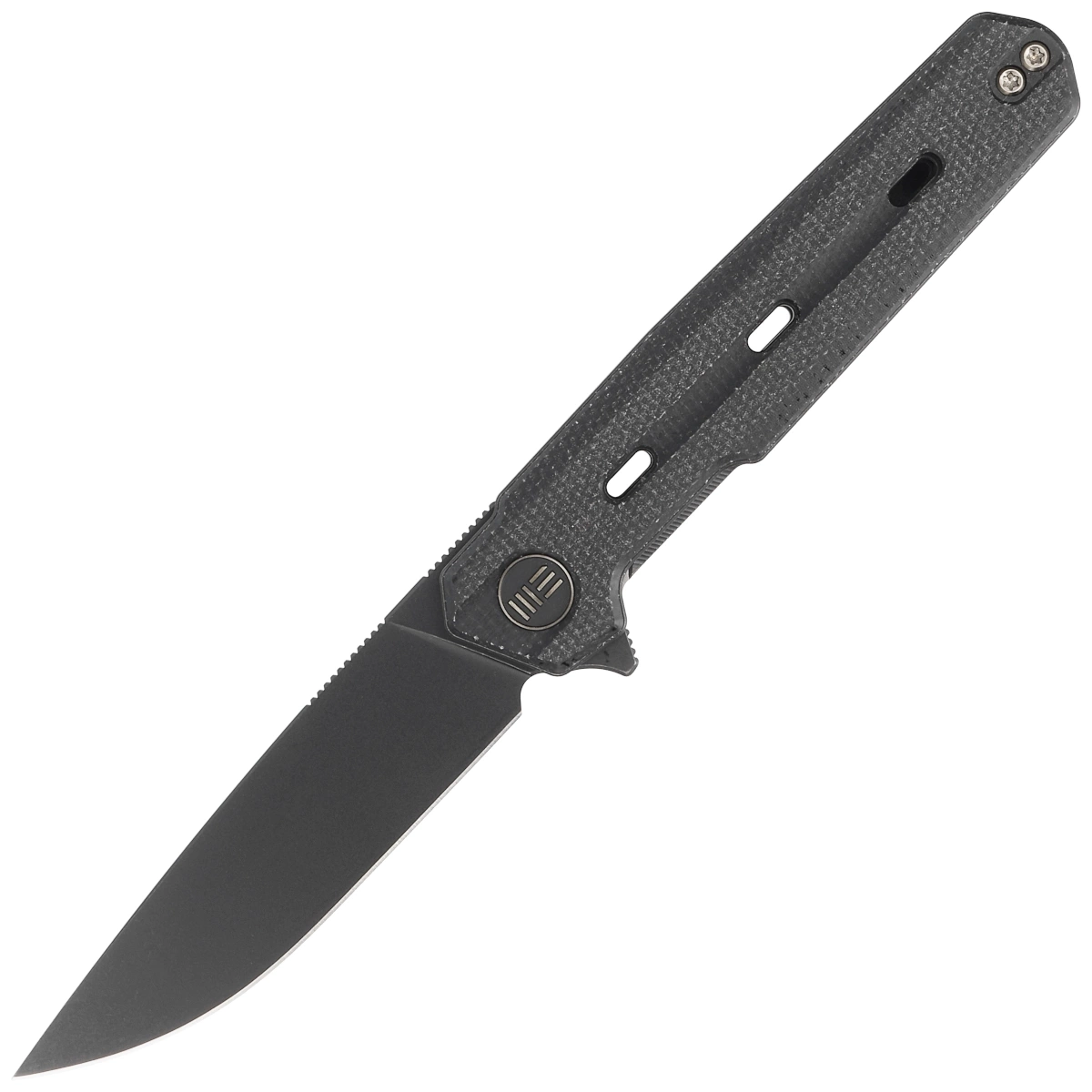Handle - Canvas Micarta (pressure-pressed canvas with synthetic resin) attached to 6AL4V titanium liners. Chamfered edges of the liners eliminate sharp edges. The grips are screwed to an intricately machined titanium backspacer, giving assurance of many years of use. The pivot axis is decorated with a stylized WE Knife brand logo. A two-position (right/left) titanium deep-carry clip allows you to carry the knife discreetly in your pocket in the tip-up (blade tip up) position. On the back of the Handle a lanyard hole, hidden in the backspacer, a place for a decorative or safety line.