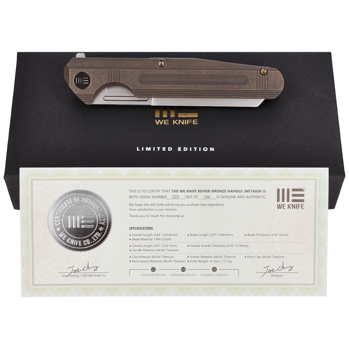 - Reiver Bronze Titanium, Silver Bead LE. Limited edition limited to only 260 pieces, one of the most impressive WeKnife with a serial number of 223. It features a modern look, fantastic fit and finish, but it's the size that makes this knife.