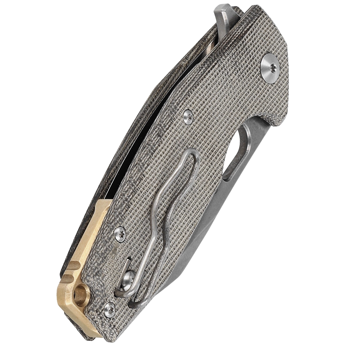 Handle - grips made of Micarta (pressure-pressed canvas with synthetic resin) insensitive to weather conditions, resistant to mechanical damage. Chamfered cover edges eliminate sharp edges for comfortable grip. Gray oxidized backspacer provides rigidity and sturdiness to the overall design. A two-position (right/left) lightweight wire clip allows the knife to be carried in the tip-up position, with the tip of the blade upward. Above the clip a hole for threading a safety or decorative cord.