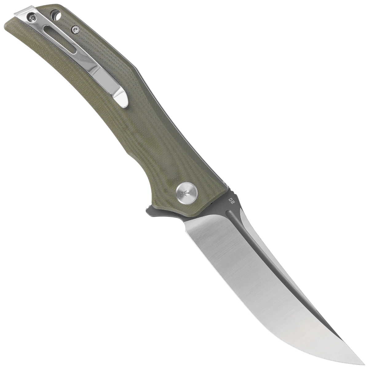 Scimitar Olive G10, Gray / Satin handy EDC folder with a slightly exotic look. Made with characteristic Bestech care. On the Handle grips made of G10, Blade made of proven D2 tool steel, and all this at an excellent price!