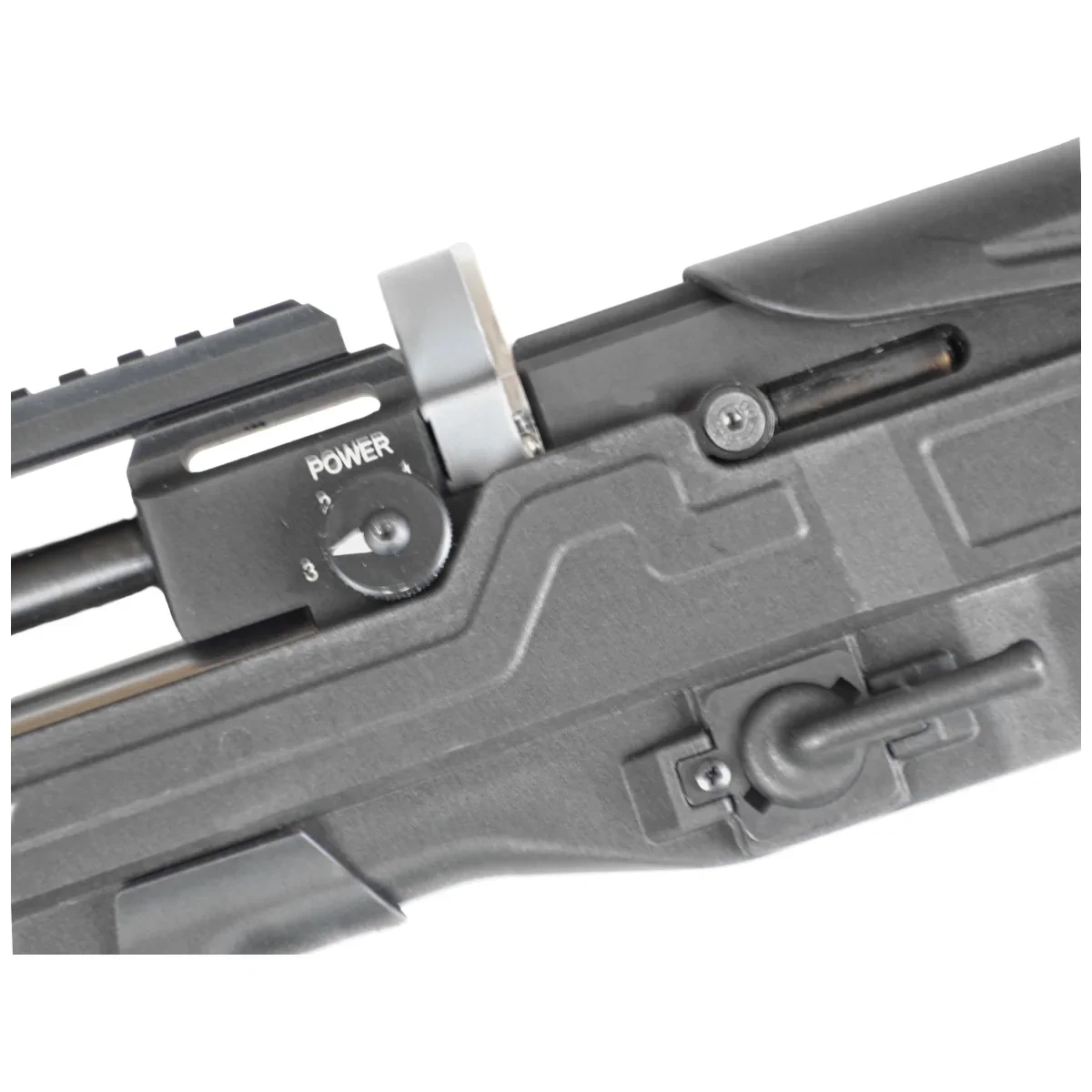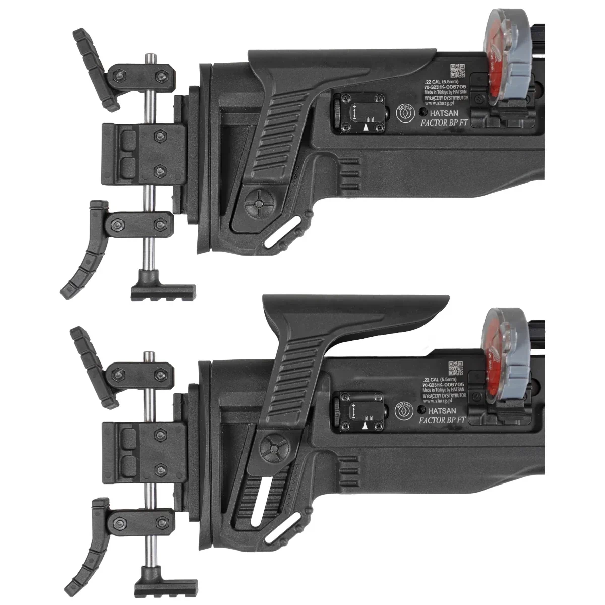 • Factor FT PCP air rifle from Hatsan, equipped with a side lever action, power adjustment regulator, trigger mechanism adjustment knob, QE barrel with an integrated sound moderator.