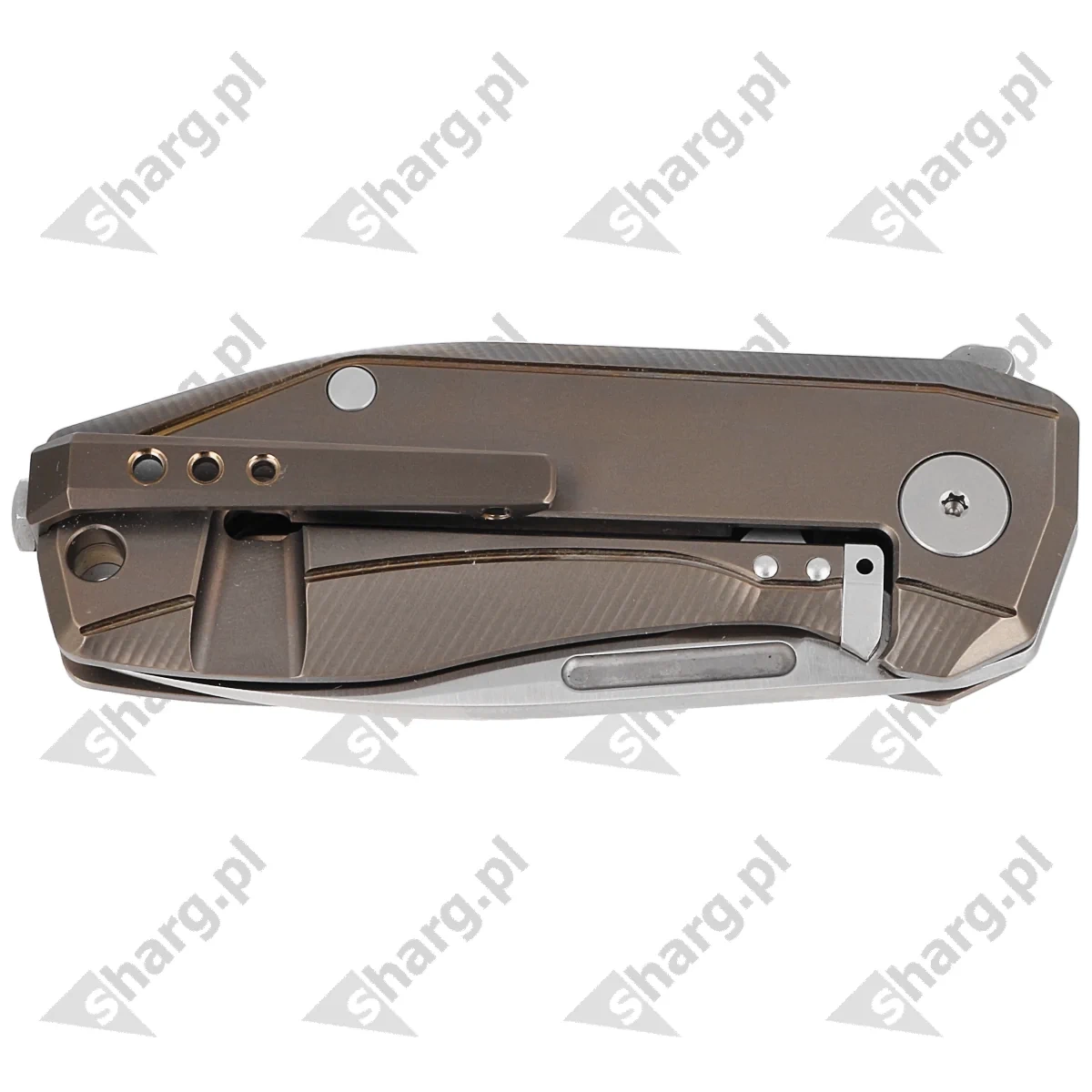 Nano Bronze Titanium, Satin advanced handheld knife. Frame lock, titanium handle. Exceptional EDC knife blade MagnaCut steel, ReF fin on the underside of the Blade, Ball bearing Double Crown, titanium clip, HY 68 key. You can always carry it with you!