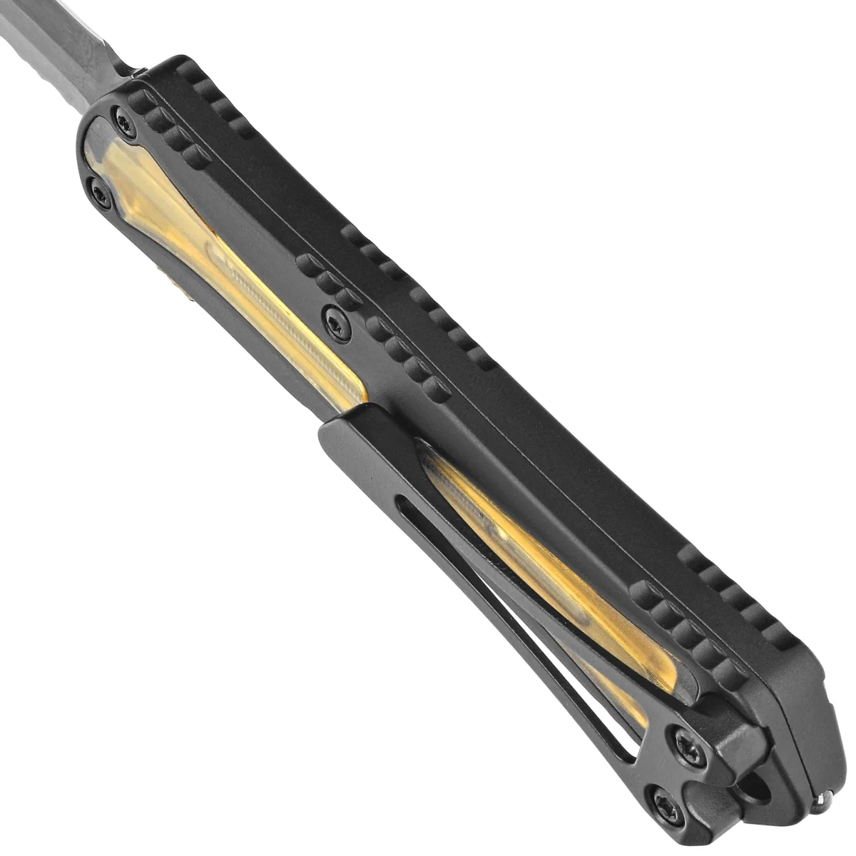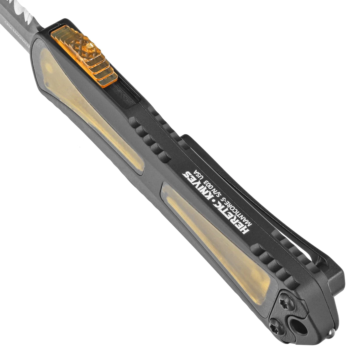• Manticore-S Double Edge Black Aluminum / Ultem, Black DLC MagnaCut compact OTF automatic knife operating in D/A (Double Action) mode, with a slider to extend and retract the blade. Customised version by Tony Marfione Jr. of Heretic Knives!