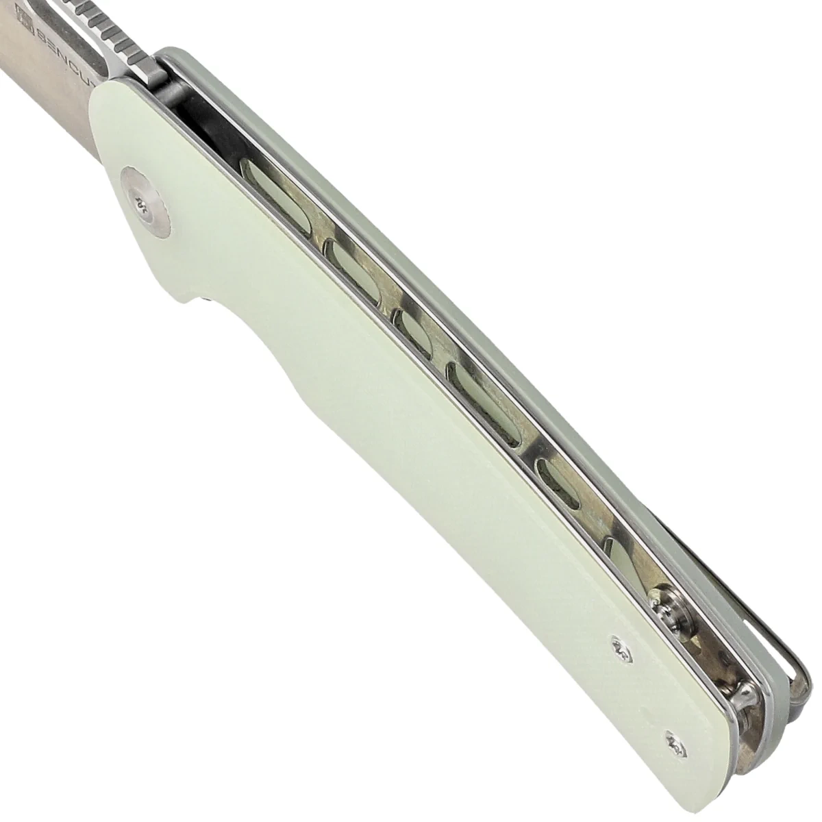 Handle - made of G10, a composite fibreglass material compressed with synthetic resin. Chamfered cover edges eliminate sharp edges for comfort and a fore finger groove improves grip security. The open-backed design, fixed with steel spacer sleeves, reduces weight and facilitates cleaning. The two-position right/left deep carry clip allows the knife to be carried discreetly in the pocket in the tip-up position (blade tip upwards).