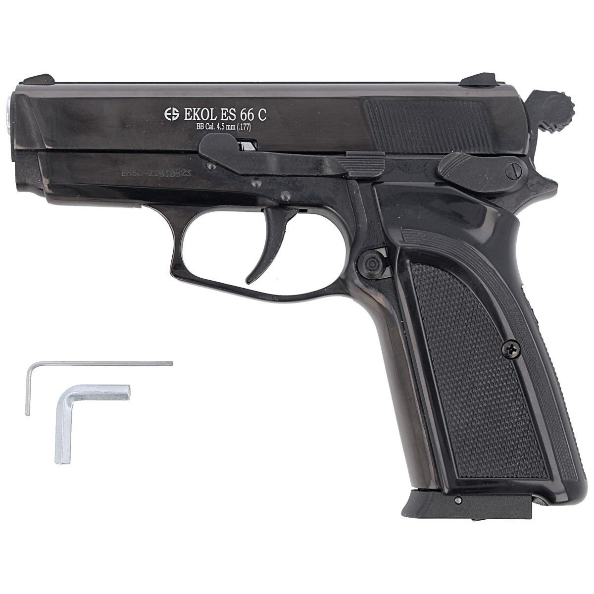 • Ekol ES 66C Black - compact air pistol designed based on blank pistol construction. With such strong heritage, this powerful pistol, reaching a velocity of 140 m/s, is well-suited for dynamic shooting and tactical training.