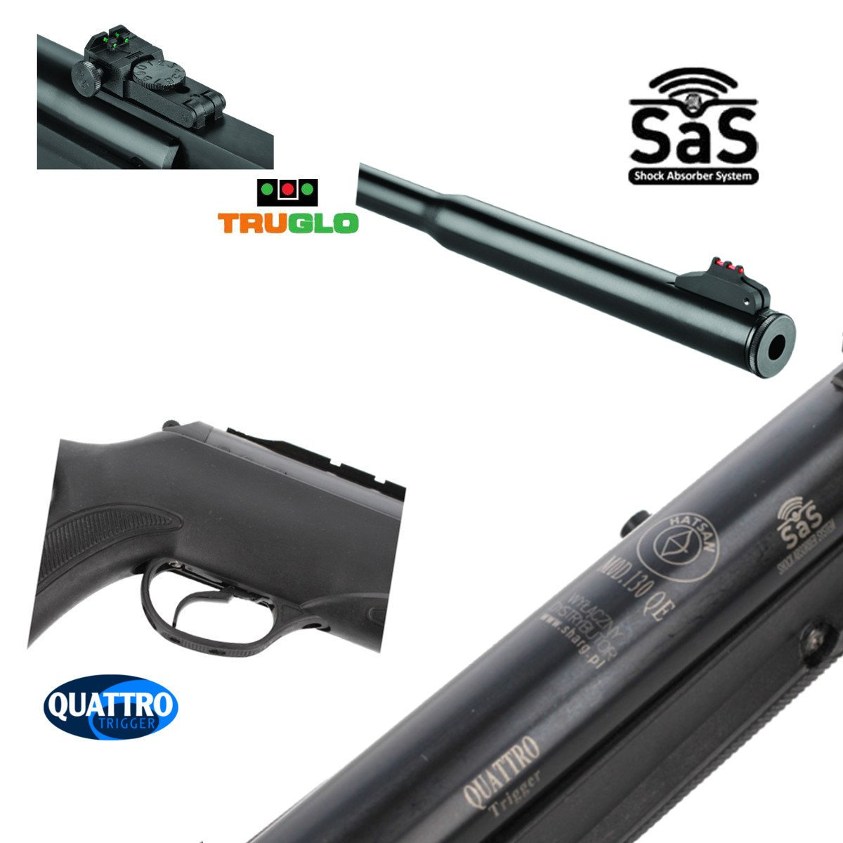 MOD 130QE modern, meticulously finished air rifle of the company Hatsan Arms with a broken qE type barrel with integrated silencer. Equipped with a piston with an extended and widened compression chamber. For those who are looking for a good, solid and accurate carbine wide-ranging. Available in calibers: .177 (4.5 mm), .22 (5.5 mm), .25 (6.35 mm) and .30 (7.62 mm).
