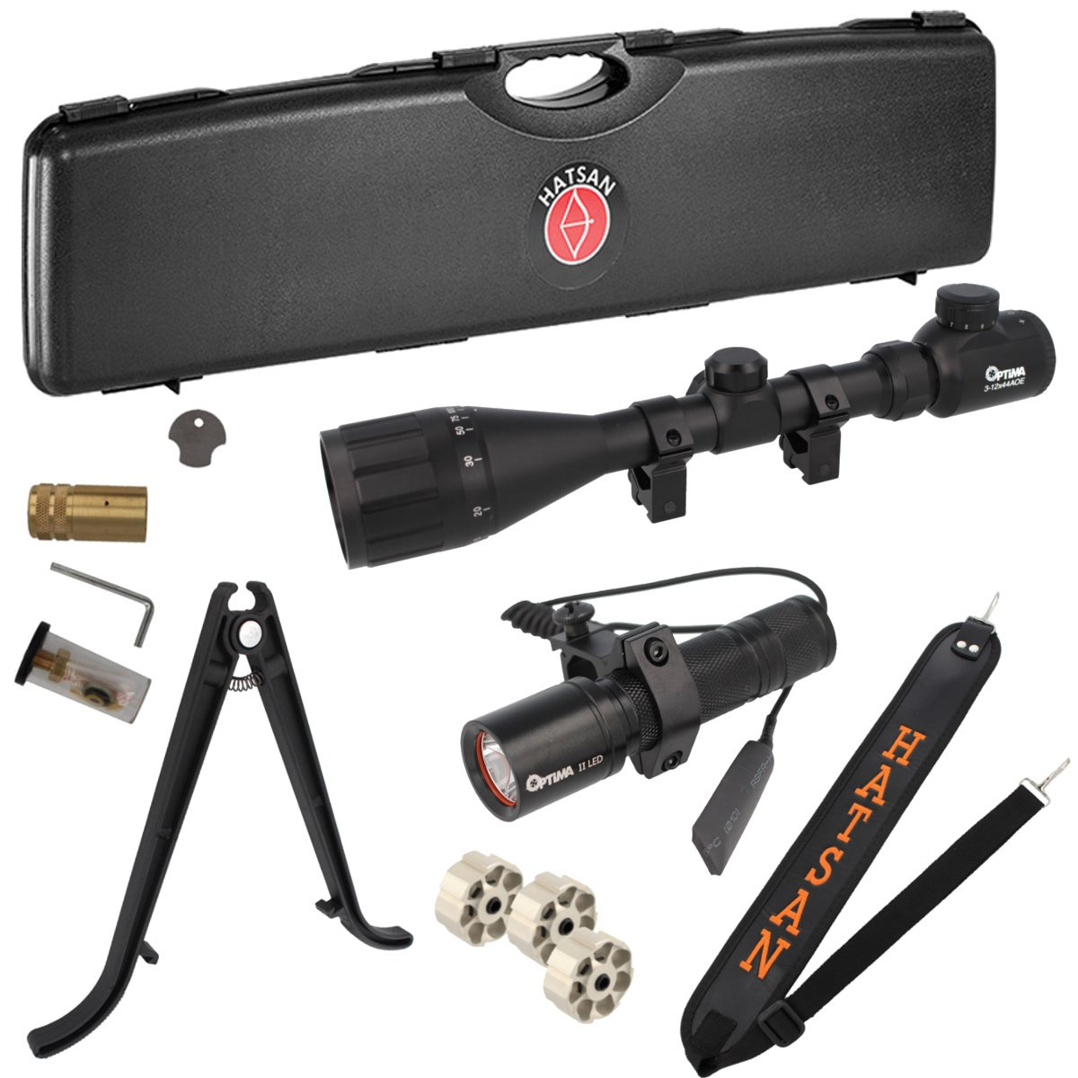 Wyposażenie dodatkowe - metalowe obrotowe bączki do mocowania zawieszenia. Nasadka / adapter (air cylinder discharging cap) do spuszczania ciśnienia z kartusza. Końcówka Quick-Fill umożliwiająca szybkie napełnianie kartusza powietrzem za pomocą pompki Hatsan Hand Pump, butli technicznej lub nurkowej (300 bar).
