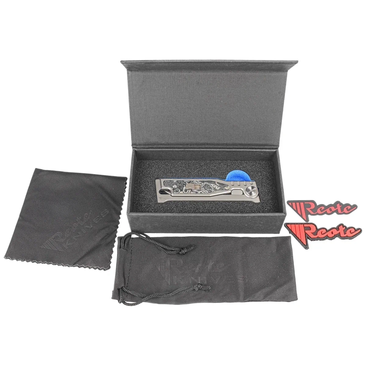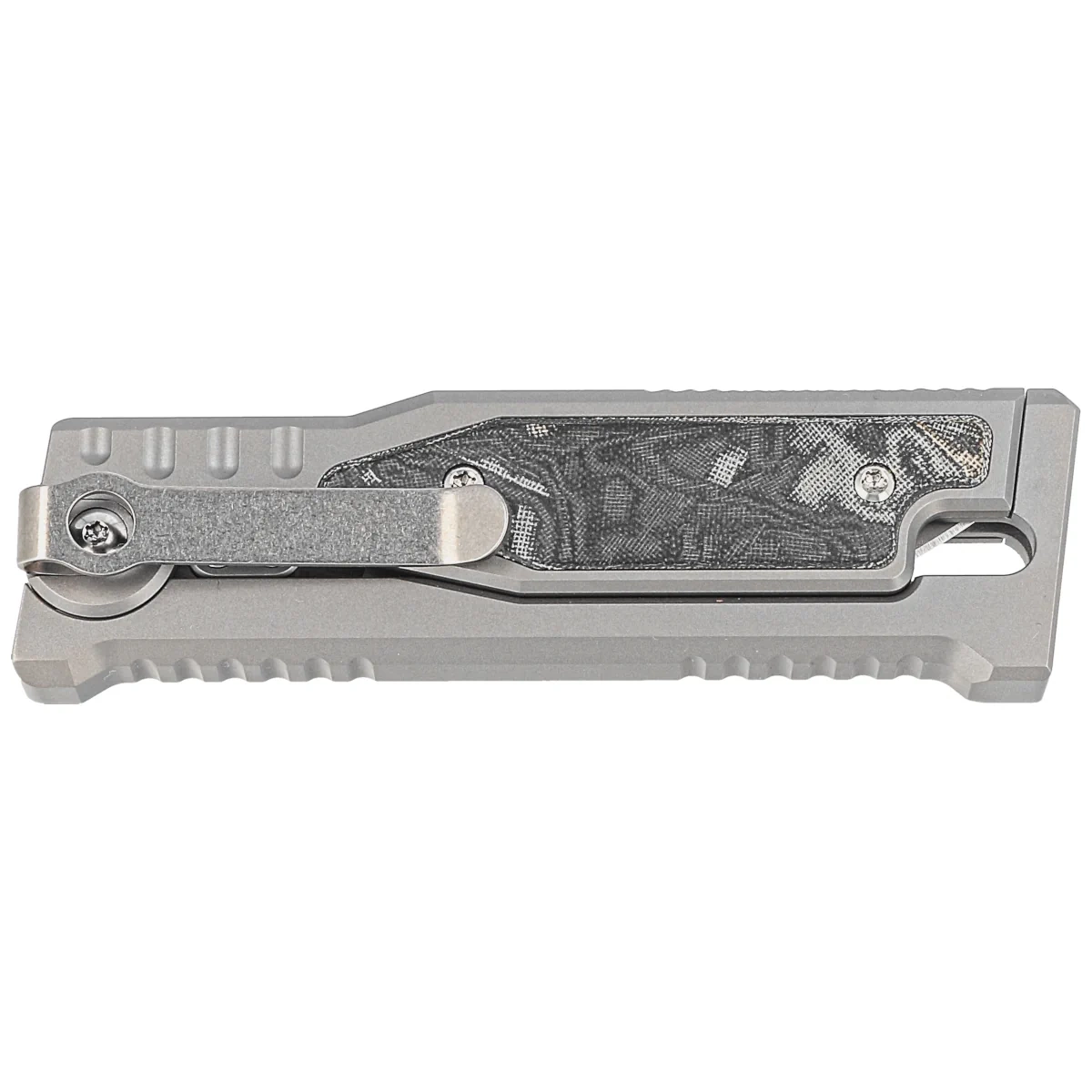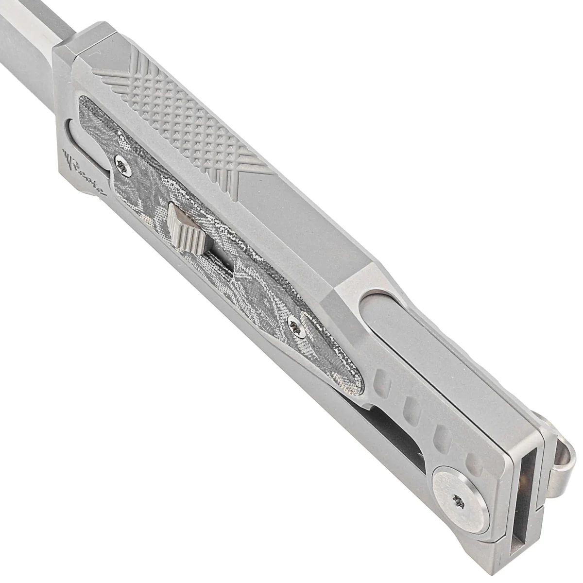Handle - CNC-milled titanium Exoskeleton, an external skeleton with a movable top section responsible for opening and closing the knife. The chamfered edges of the sheaths eliminate sharp edges, and the perfectly matched Burl Linen micarta inlays add an exclusive touch and improve grip security. On the right side, an artful sliding lock slider for advancing/retracting the blade. Once it is moved to the secure "lock" position, the knife will not be opened/closed by accident. A single-position titanium (right) deep-carry clip allows you to discreetly carry the knife in your pocket in tip-down position (blade tip down).