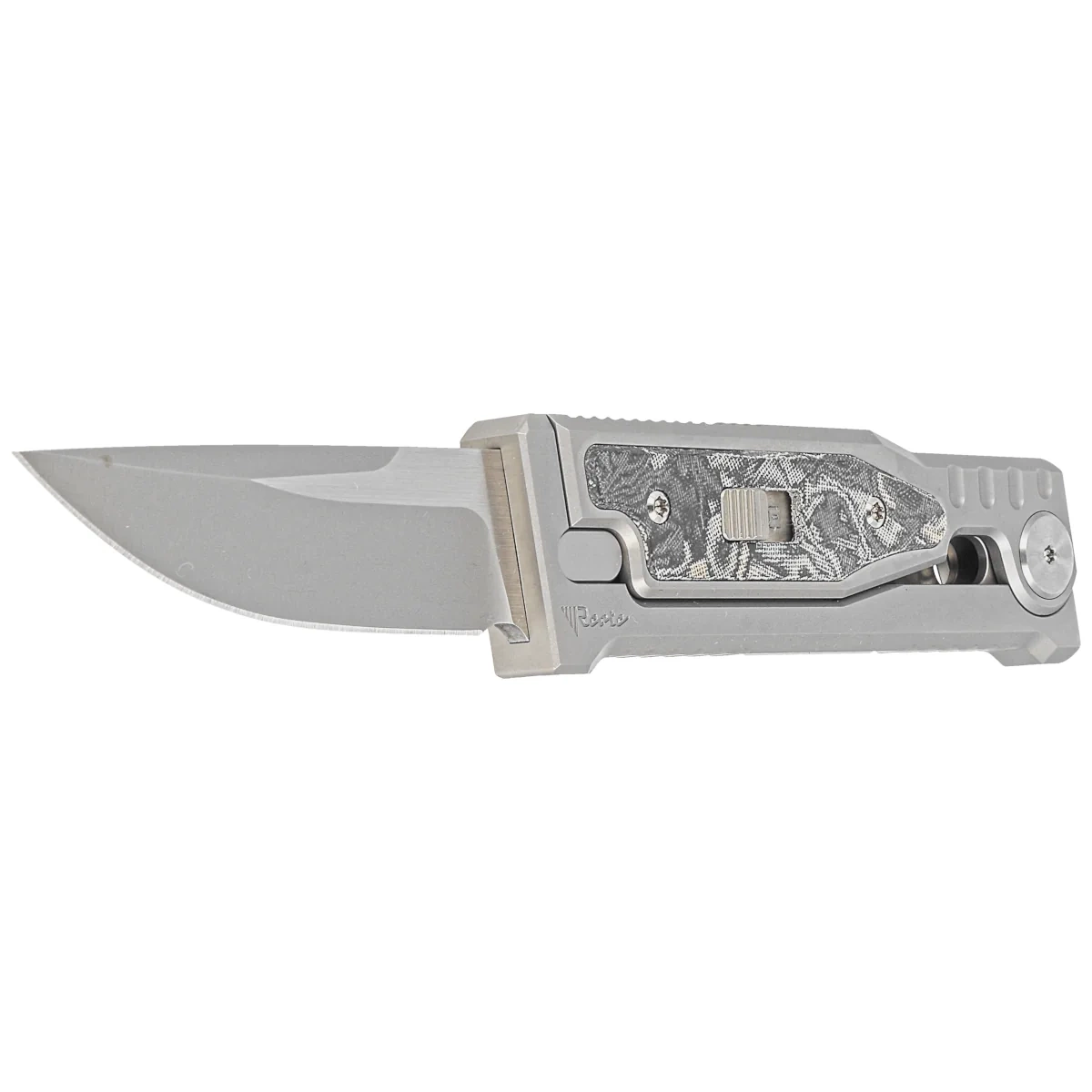 Reate Knife Mini EXO OTF Gravity Drop Point Bead Blasted Titanium/Burl Linen Micarta, Stonewashed CPM 3V