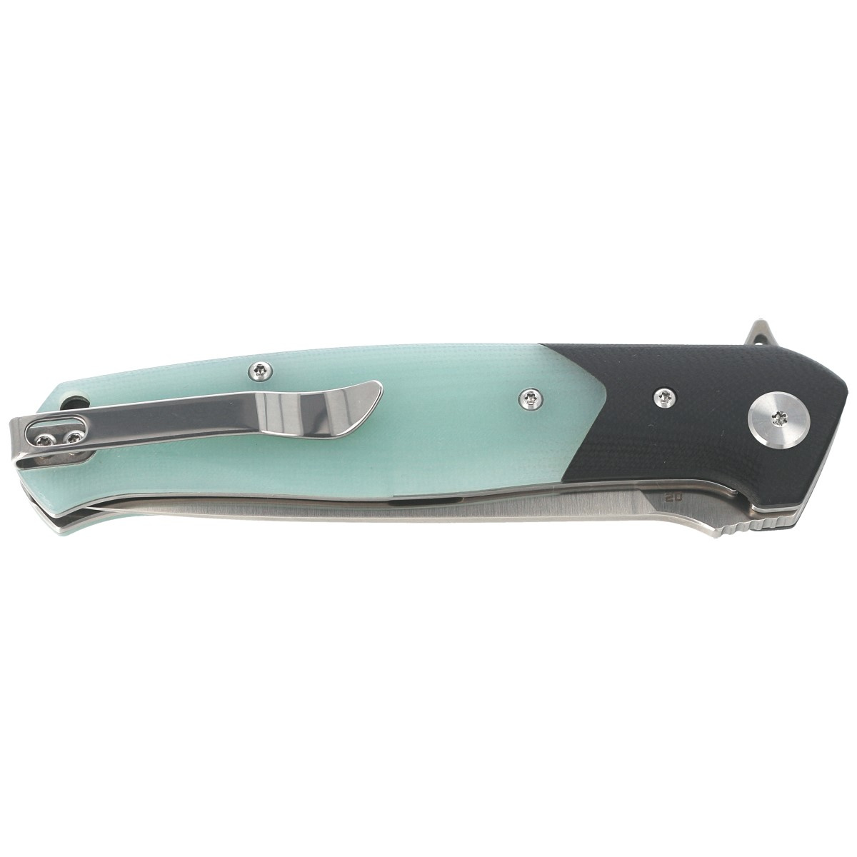 Handle - the grips in the form of a black bolster and jade rest of the handle made of smooth G10 (fiberglass compressed with resin) laminate. The chamfered edges of the covers eliminate sharp edges and the textured surface improves grip confidence. The backspacer also made of G10, to which the grips are attached, guarantees the rigidity and strength of the entire structure. A single-position, right-handed clip allows the knife to be carried in tip-up position, with the tip of the blade upward. Above the clip a hole for threading a safety or decorative cord.