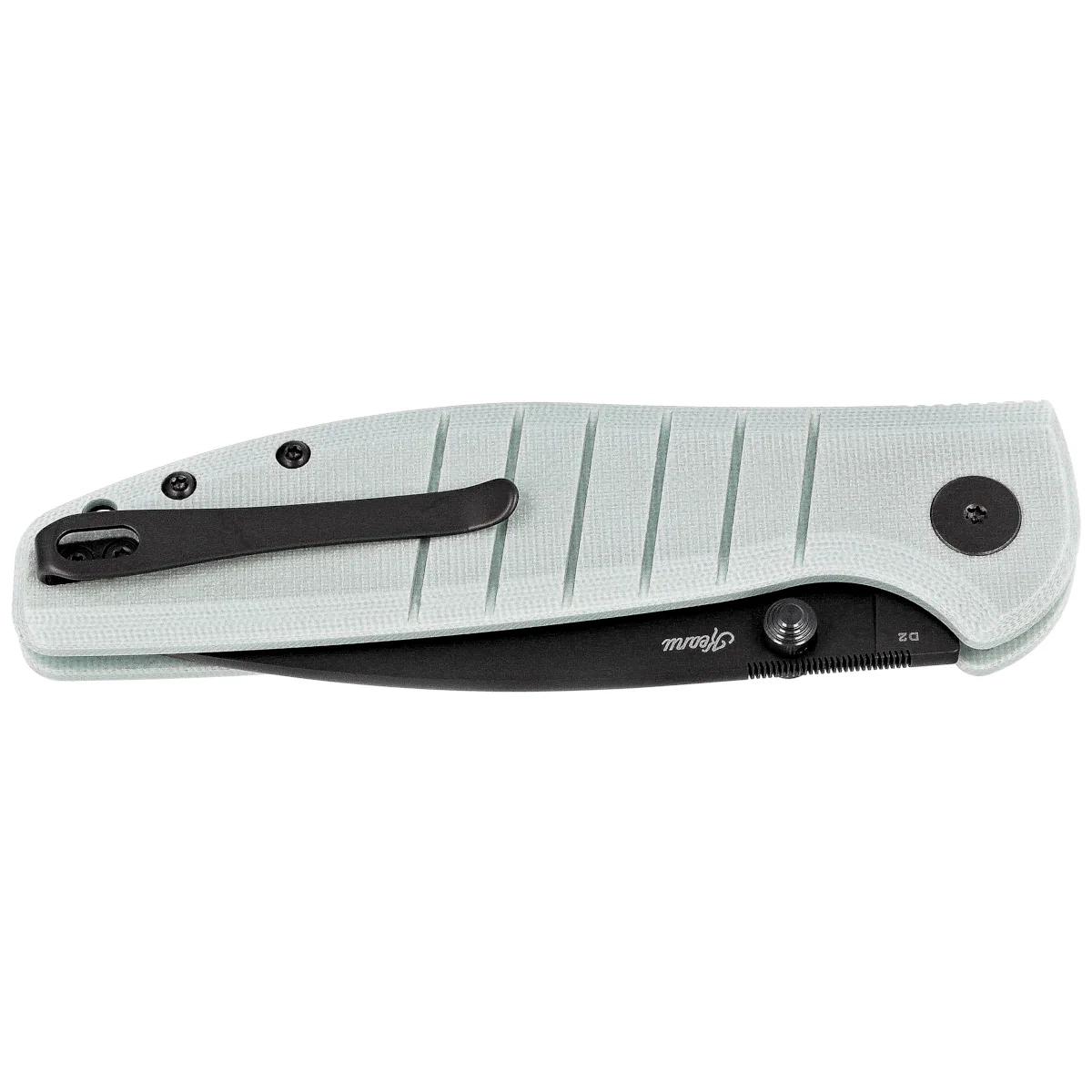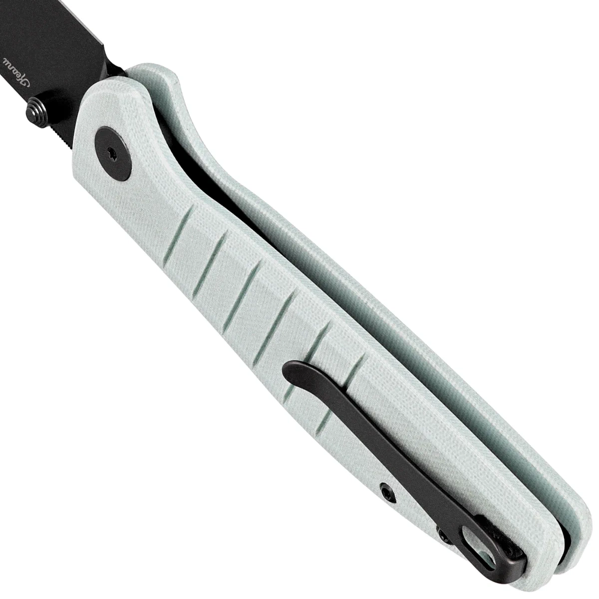 Handle - made of G10, a composite fiberglass material compressed with synthetic resin. The aggressive texture of the grips provides a firm grip, even with wet hands. The cover's chamfered edges eliminate sharp edges for comfort, and the finger indentation made on the front improves ergonomics. The open-backed design fixed with steel spacer sleeves reduces weight and makes cleaning easier. A two-position right/left deep carry clip allows you to carry the knife discreetly in your pocket in tip-up position (blade tip up).
