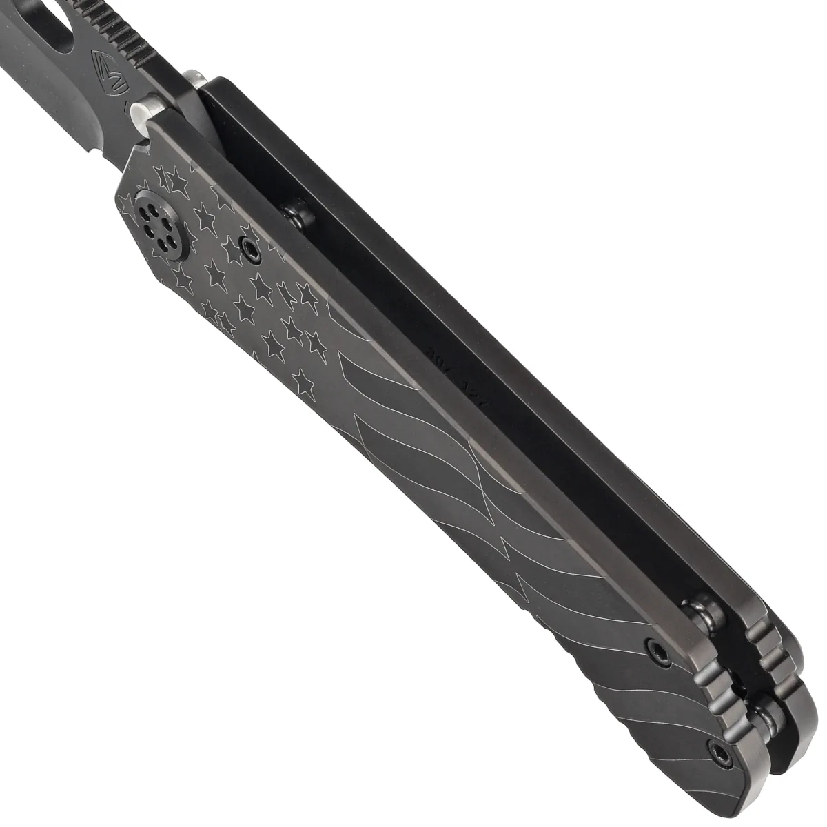 187 DP Black PVD "Ghosted Flag" Titanium, PVD HW, PVD w/Bronze Clip, Black PVD D2 is a powerfully built folding knife ideal for men with large hands and suited for almost any task where a knife is needed. It is opened with an oval hole in the blade. The concave grind on the D2 steel blade was made by hand. This is unique in the knife industry; only a few manufacturers is capable of make a concave grind by hand. When opened, a solid framelock holds the blade in place. The stop-pin has been pressed into the blade so that it rests symmetrically against the handle, which brilliantly increases durability. The knife gets its name from the thickness (0.187") of the titanium scales used in the construction of the handle. Made entirely in the USA, according to the high standards set by Medford