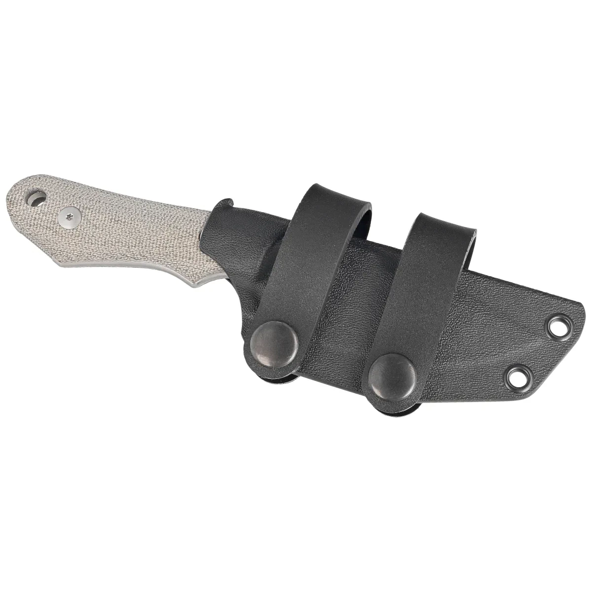 Handle - ergonomically profiled with finger notches. 3D machined Green Canvas Micarta composite scales (pressure-pressed canvas with synthetic resin) attached directly to the blank. This is the simplest and most secure design that ensures the practical indestructibility of the knife. The advantage of Canvas Micarta is its insensitivity to weather conditions, resistance to chemicals and mechanical damage, as well as its low weight. On the back of the Handle lanyard hole, a hole for belay or decorative rope.