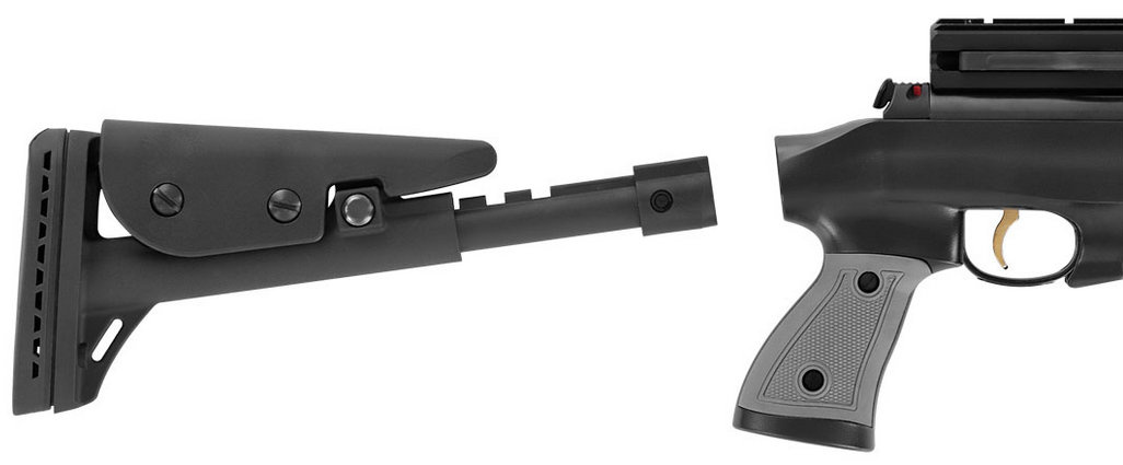 Flask - made of polymer and aircraft-grade aluminum, telescopic tactical flask TTS (Tactical Telescopic Stock). Adapted for right and left-handed people. Stepwise adjustment in the range of 4" (10 cm) allows to adjust the length of the flask to the build and preference of the shooter. Adjustment tank heights with screws. Energy absorbing ventilated rubber foot. When the flask is removed, it is possible to use only the pistol grip.