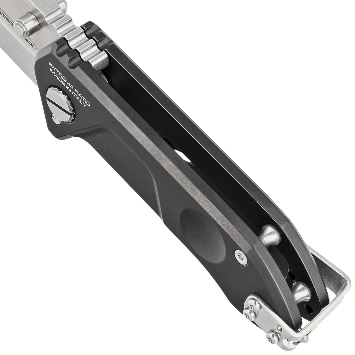 Handle - grips made of black anodized titanium. Chamfered edges of the covers eliminate sharp edges and Extrema Ratio's characteristic finger recesses improve grip security. The so-called open-backed design without the typical backspacer, fastened together with steel spacer sleeves for easy cleaning. Simple, sturdy construction provides assurance of many years of use. A two-position (right/left) steel deep-carry clip allows you to carry the knife discreetly in your pocket in tip-up position (blade tip up). Below the pivot screw is a smaller opening force adjustment screw, depending on your preference you can set yourself the amount of force needed to open the knife.