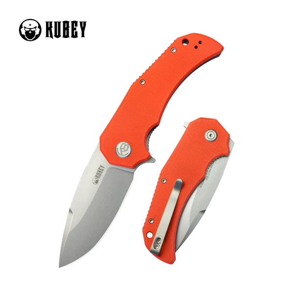 Handle - grips made of G10 composite, a material extremely mechanically durable and practically completely resistant to weather conditions and chemicals, textured to improve grip confidence, screwed to the knife' s steel frame. Chamfered edges of the sheaths eliminate sharp edges for comfort and improve grip confidence. The solid G10 backspacer to which the facings are attached guarantees the rigidity and strength of the entire structure. The simple, solid design gives you the assurance of many years of use. A deep finger groove (fore finger groove) improves grip security. The pivot axis is decorated with a stylized Kubey Knife brand logo and a steel cap (pivot cap). A two-position (right/left) deep carry clip allows you to carry the knife discreetly in your pocket in the tip-up position (blade tip up).