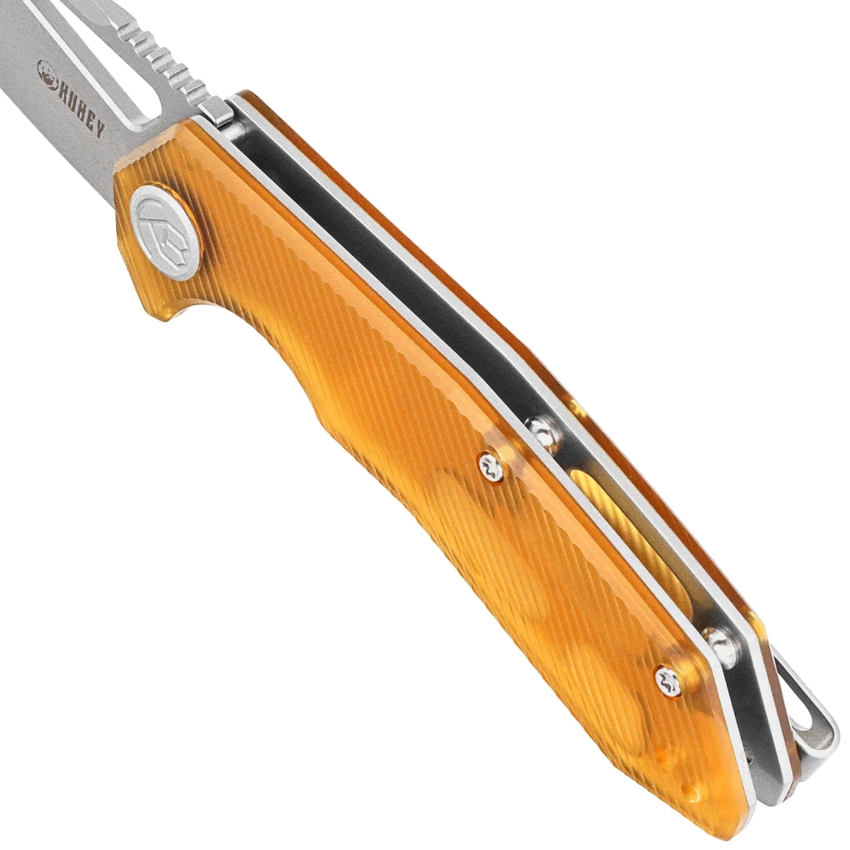 Handle - liners made of transparent Ultem™ plastic, textured for improved grip, bolted to the knife's steel frame. Chamfered edges of the sheaths eliminate sharp edges for comfort and improve grip confidence. The so-called open-backed design without the typical backspacer, fastened together with steel spacer sleeves for easy cleaning. The simple, secure design provides confidence for years of use. A deep finger undercut (fore finger groove) improves grip security. The pivot axis is decorated with a stylized Kubey Knife brand logo. A two-position (right.left) titanium deep carry clip allows you to carry the knife discreetly in your pocket in tip-up (blade tip up) position.