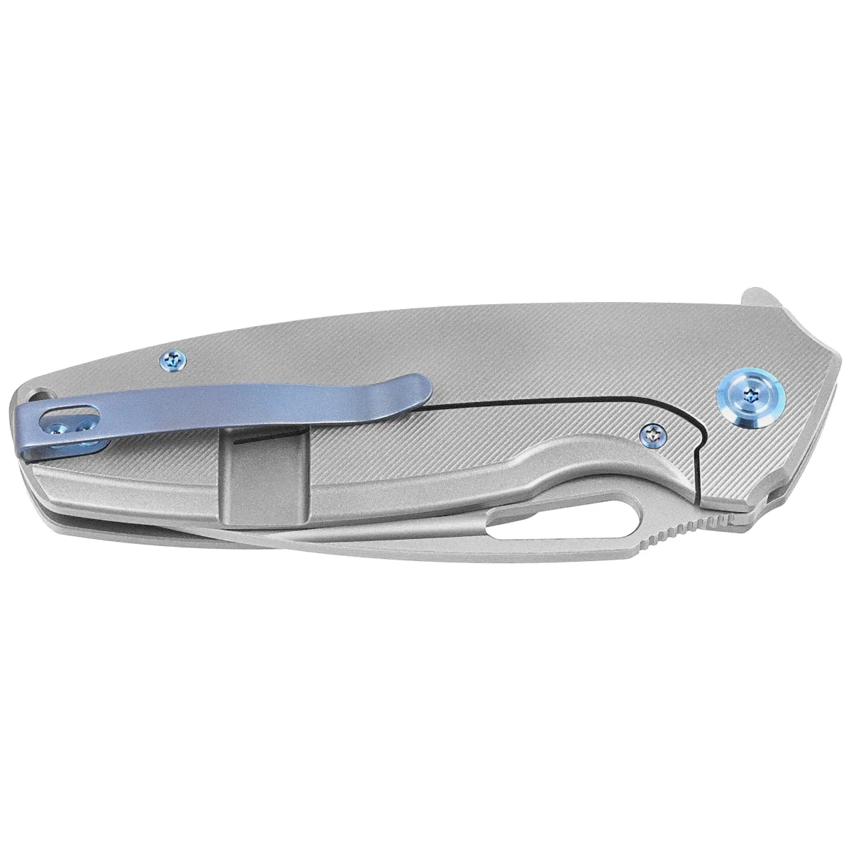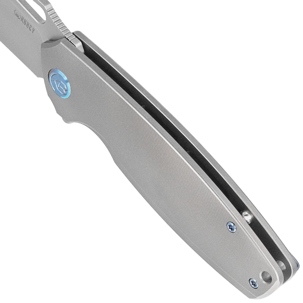 Handle - is two pieces of solid gray titanium 6AL4V finished with fine texture on CNC milling machines. The chamfered edges of the covers eliminate sharp edges for comfort and improve grip security.The open-backed design, so called, fastened together with steel spacers, reduces weight and facilitates cleaning. The simple, sturdy design provides assurance of many years of use. Deep finger undercut (fore finger groove) improves grip security. The pivot axis is decorated with a stylized Kubey Knife brand logo. A single-position (right) titanium deep-carry clip allows you to carry the knife discreetly in your pocket in tip-up position. Above the clip a lanyard hole, a hole for threading a safety or decorative cord.
