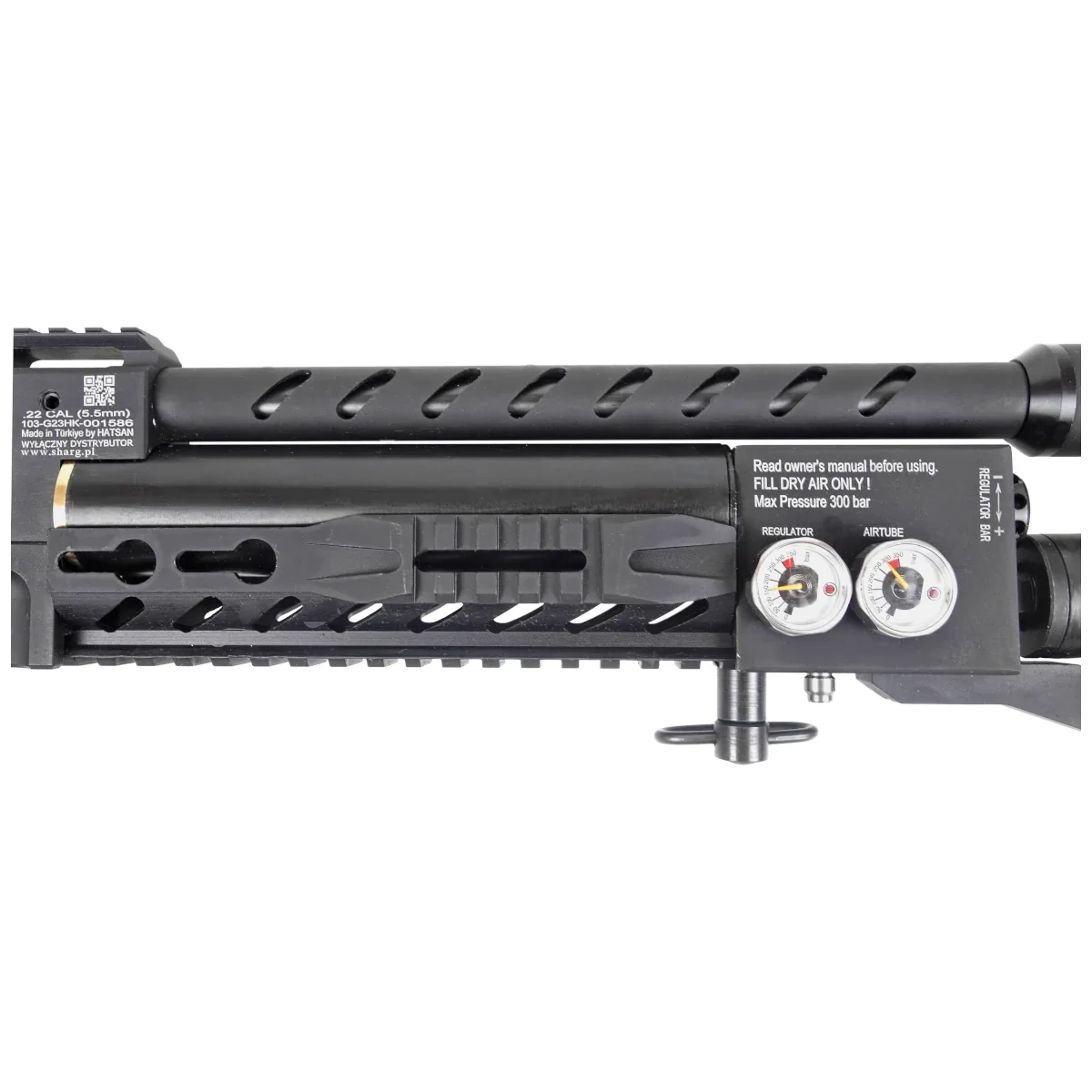 FACTOR SNIPER L, the latest generation of air rifles from Hatsan. A PCP rifle in a practical tactical stock with a pistol grip. Thanks to the telescopic stock in the AR-15 system and the adjustable cheek rest, the rifle can be fully customized to your preferences. The spacious air tank of 700cc 300bar satisfies enthusiasts of long shooting sessions without worrying about refilling the cartridge. The air rifle is equipped with a precise rifled barrel with an integrated suppressor, a pressure regulator with external adjustment capability, a striker with adjustable force, a biathlon style Side Lever charging handle, a double optics rail 11 and 22 mm, and a match trigger with adjustable pull weight and travel length. Available in calibers: .22 (5.5 mm), .25 (6.35 mm), .30 (7.62 mm), and .35 (9 mm).