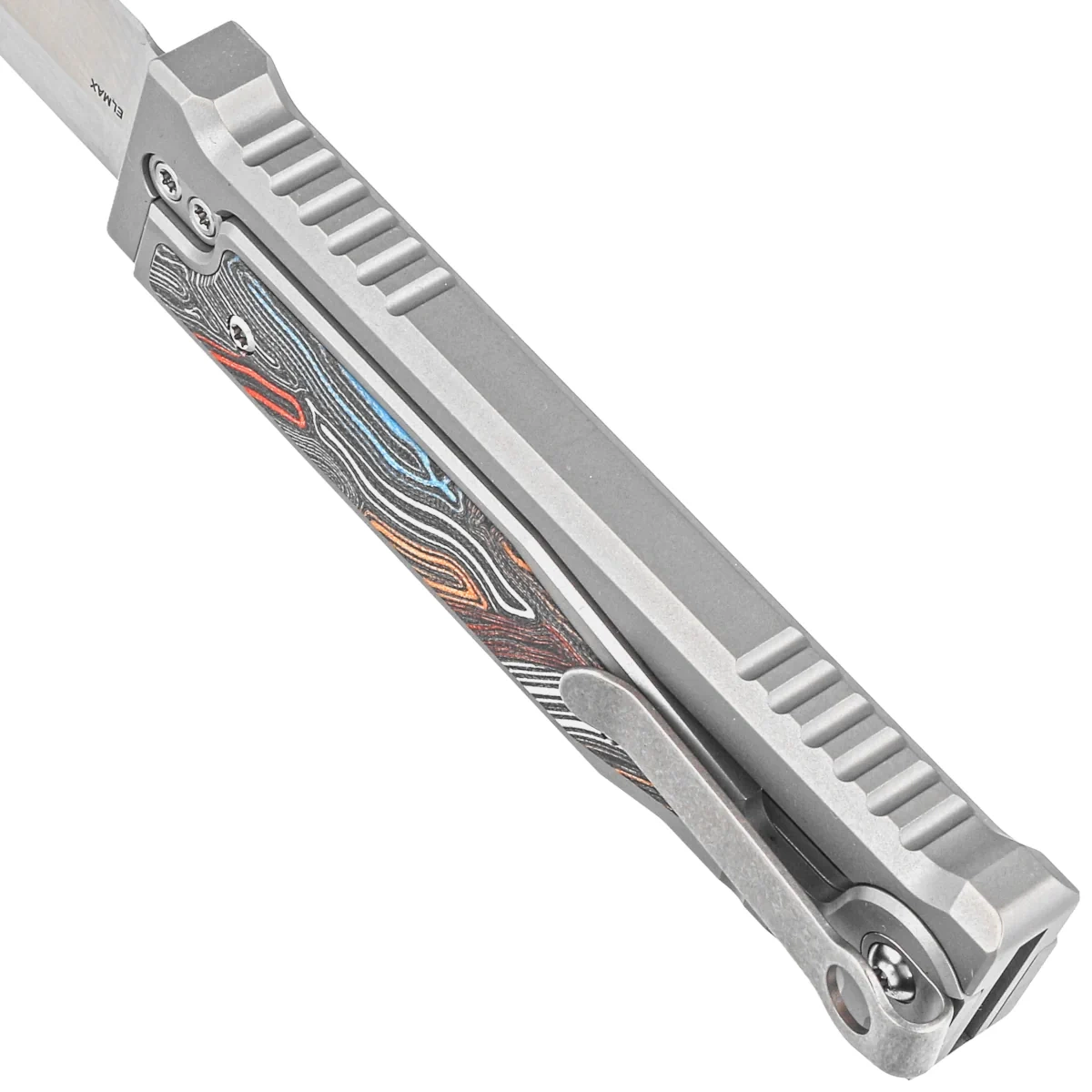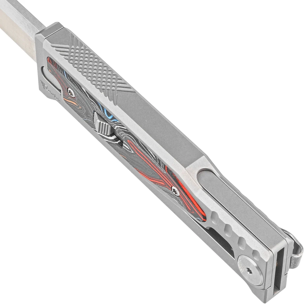 Handle – CNC-machined, titanium Exoskeleton construction. The external frame features a movable upper section responsible for opening and closing the knife. The chamfered edges of the sheaths eliminate sharp edges, and the perfectly matched G10 composite inlays in the unique Damascus pattern add an exclusive touch and improve grip security. On the right side, there is a finely crafted sliding lock slider for blade deployment and retraction. When shifted into the safe “lock” position, the knife cannot open or close accidentally. A single-position titanium deep-carry clip (right side) allows discreet pocket carry in a tip-down orientation (blade tip pointing down).