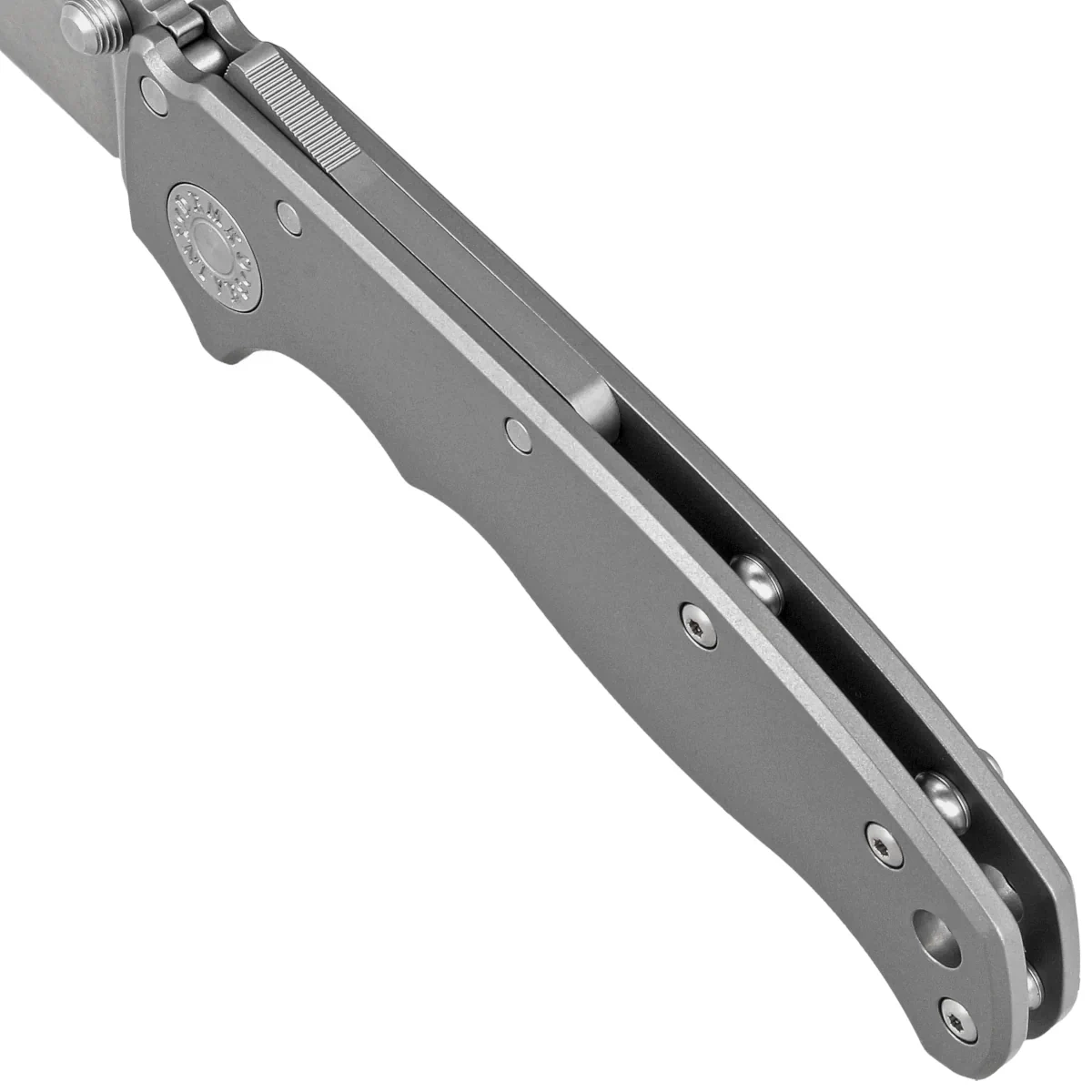 Handle - made of 6AL4V titanium with a slightly rough texture, whose chamfered edges of the covers eliminate sharp edges for comfort, and the fore finger groove made on the front improves grip security. A single-position, right-handed clip allows the knife to be carried in the tip-up position, with the tip of the blade upward. A left-handed clip is included.