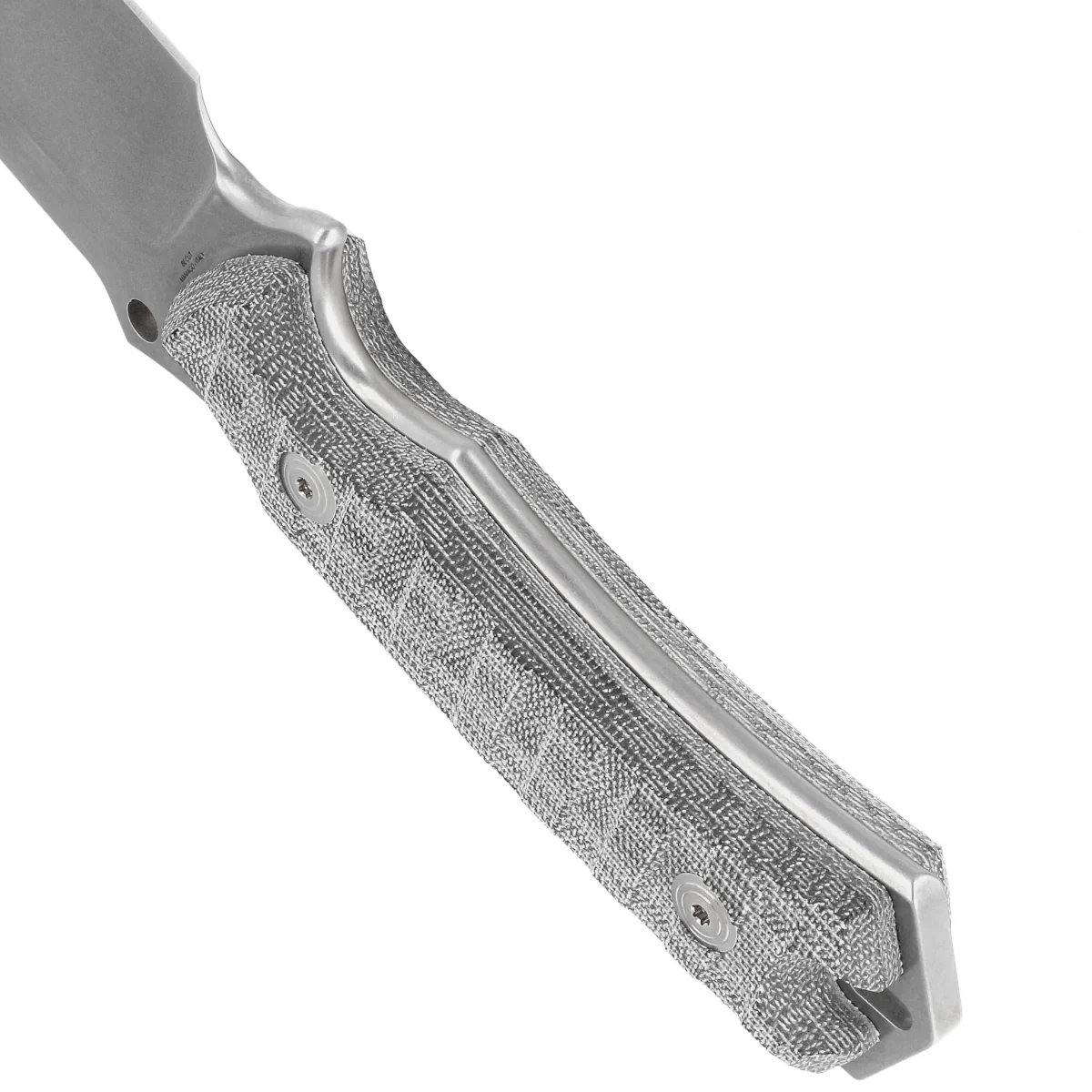 Handle - profiled grips made of Micarta, a virtually indestructible plastic that is insensitive to weather conditions, resistant to chemicals and mechanical damage. The chamfered edges of the covers eliminate sharp edges and the textured and textured surface improves grip confidence. The grip covers are attached to the shank with Torx screws. Fore Finger Groove, a deep cut under the finger prevents the hand from accidentally slipping on the blade. In the back, a protruding section of the tang can be used as an improvised hammer or glass breaker. It is also used to strike sparks from a magnesium flint.