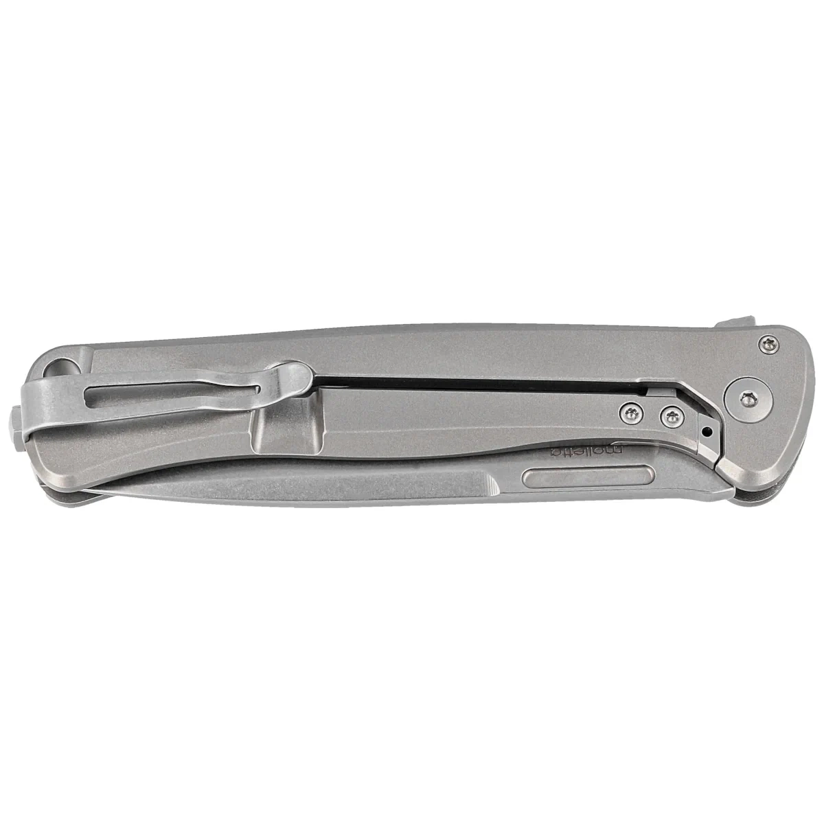 Blade - Drop Point finished with a scratch-masking bath of fine Stonewashed pebbles. Plain blade brought out with a Flat Grind which gives excellent cutting edge geometry and extreme cutting performance. Frame-Lock reinforced, monolithic 6AI4V titanium blade lock with a steel inlay to prevent wiping of the lock face. Located on the underside of the blade, the IKBS-assisted protrusion / flipper makes it easy to open the blade. In the open position it serves as a lower guard / hilt protecting the hand from slipping off the handle. In the upper part, the characteristic milling used to open the knife with the Flipper removed.