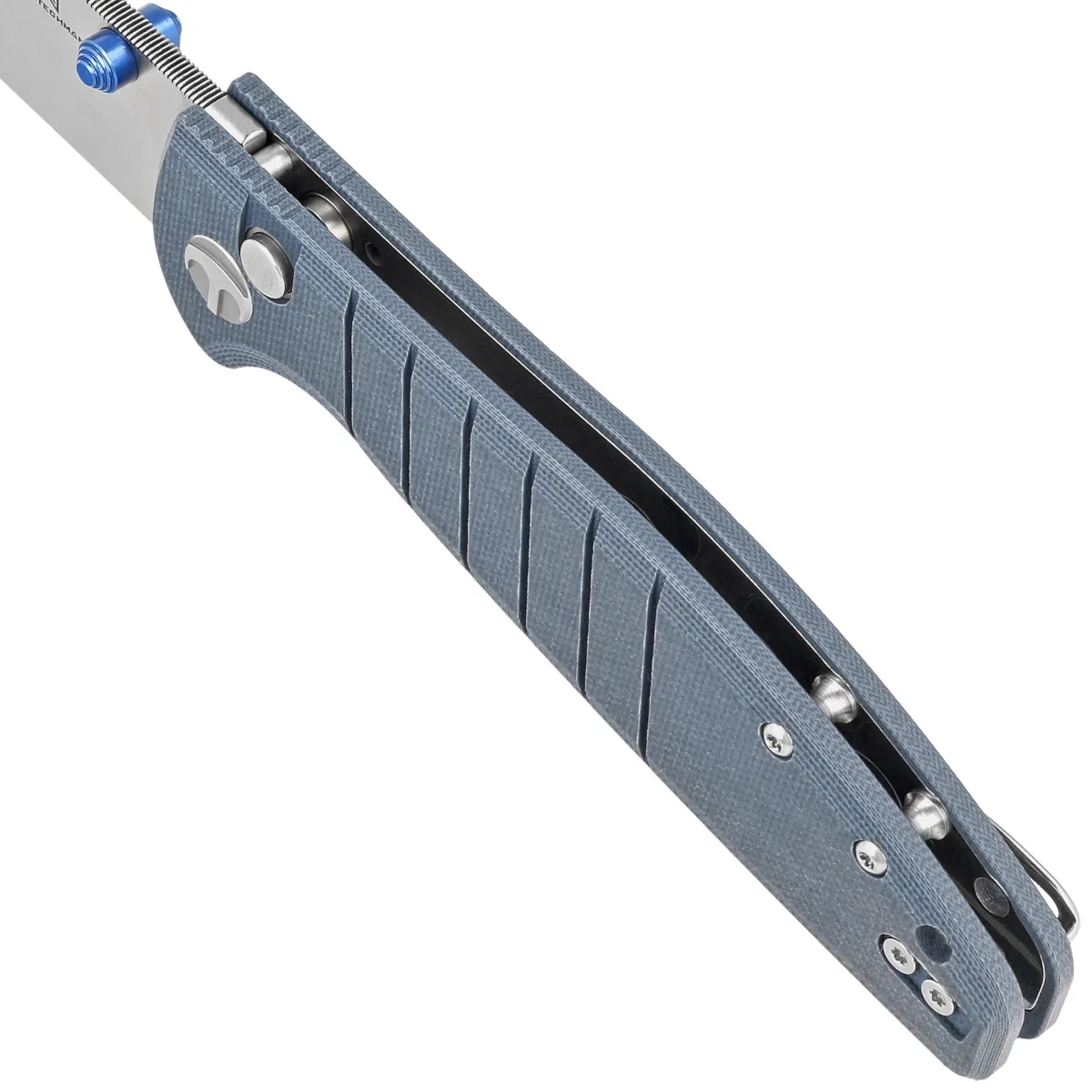 Blade - Drop Point type with a long cutting edge, finished with an elegant satin finish. The small thickness of the blade, combined with a high flat grind, gives excellent cutting edge geometry and extreme cutting performance. Ball bearing ceramic supports the smooth operation of the blade's opening mechanism, which can be opened with a double-sided peg in the wedge (dual thumb stud). The stud has been anodized blue which provides a nice contrast to the color of the wedge. On the back of the upper jimping wedge, a notched thumb rest. The whole thing is locked with a solid button lock.
