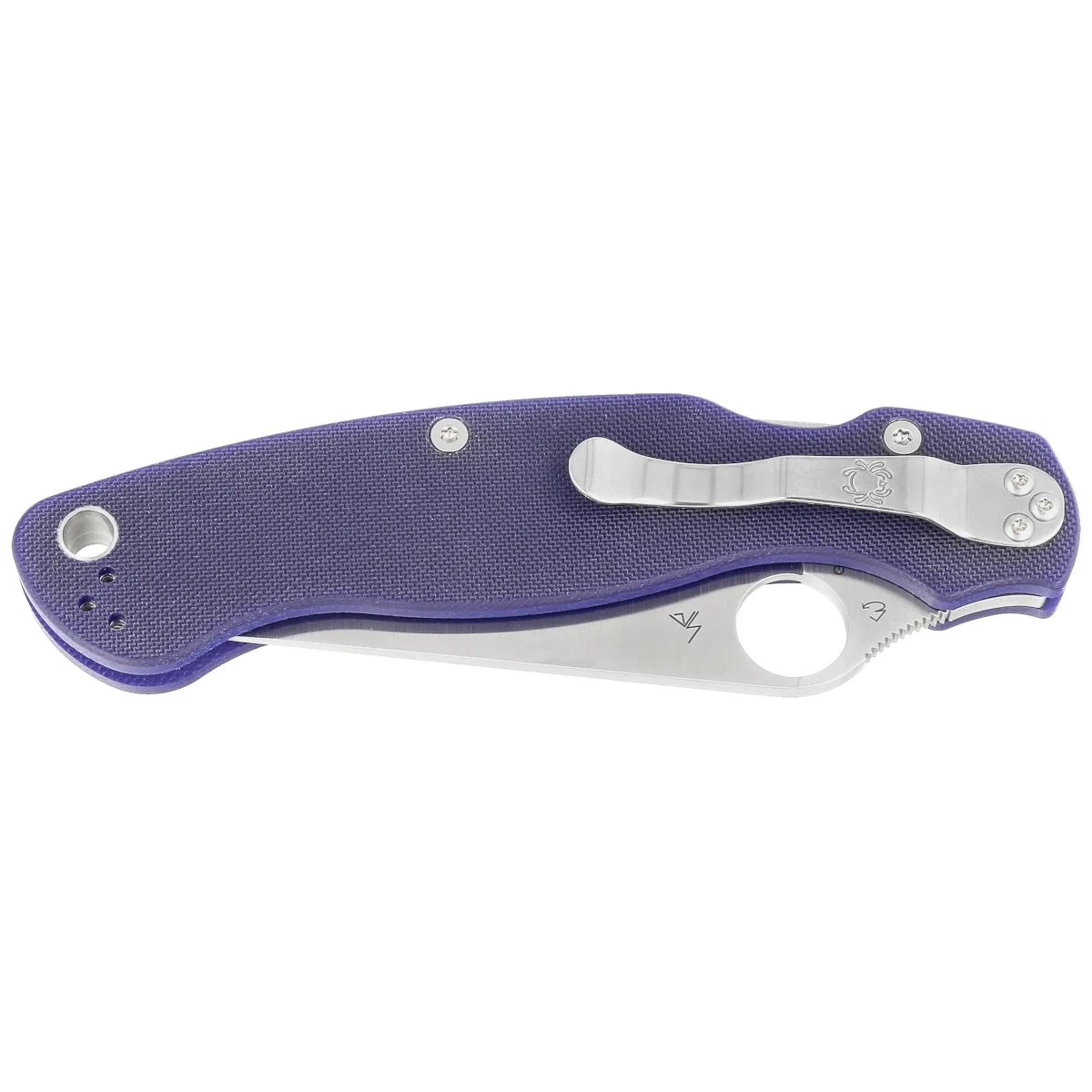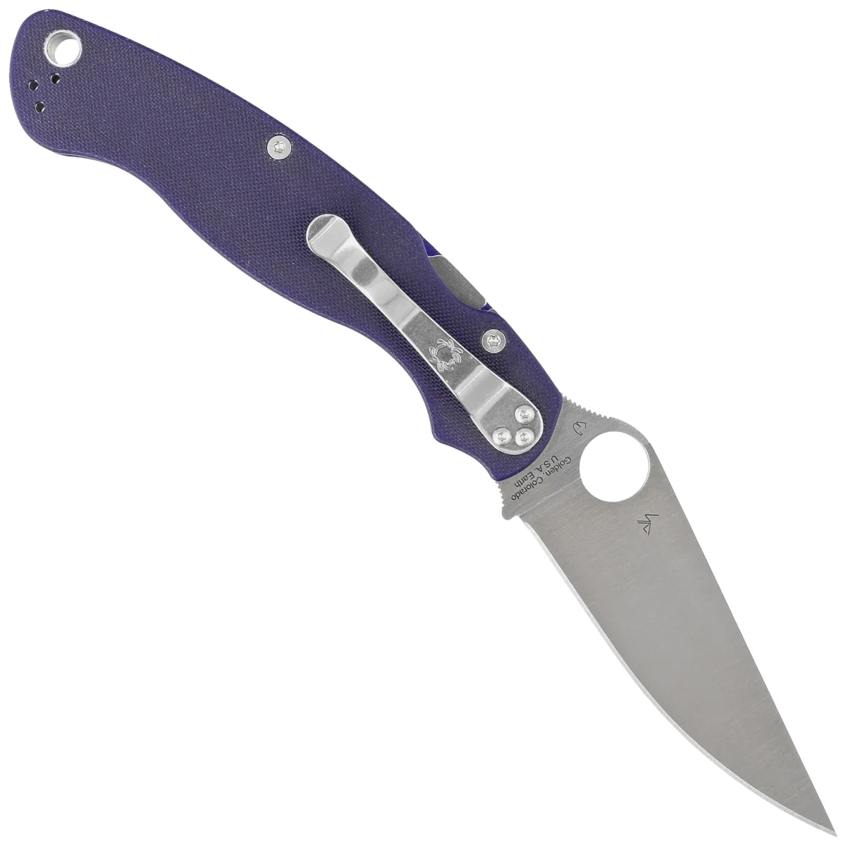 - Military 2 Dark Blue G10, Satin Plain, the second edition, continuously produced for over 25 years, of Spyderco's iconic Military model. Stronger, intuitive Compression Lock, reinforced steel liners, same aggressive look and utility!