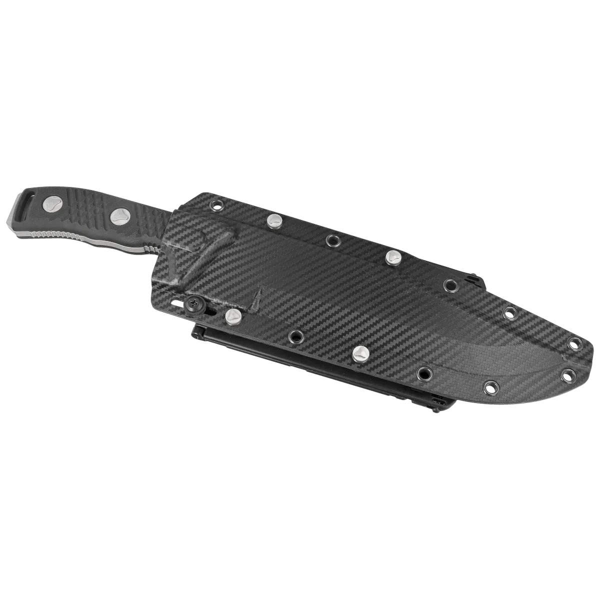 Sheath - made of carbon fiber laminated kydex, provides a secure hold on the knife in any position. The M.O.L.L.E. type attachment to the belt or to the equipment's shoulder strap allows the knife to be carried vertically or horizontally.