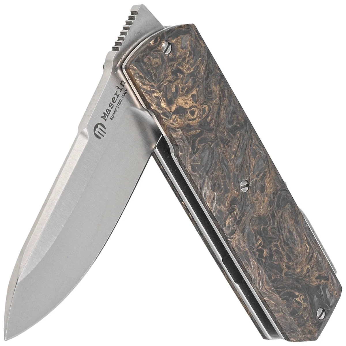 410 Silver Black/Gold FatCarbon, Satin is an exceptional folding knife, the result of a collaboration between renowned Italian knifemaker Bruno “Graciut” Bruna and Maserin. The blade is made from what is considered one of the best Elmax knife steels, known for its strength and long blade life. The Satin finish adds elegance to its appearance. Handle made of Fat Carbon, a simple shape to fit any hand. Fat Carbon is a lightweight, highly durable composite with a fractal pattern. It is not only a tool, but also a piece of functional art. Sophisticated details and exceptional workmanship make it deserving of a place in any knife collection. The Maserin 410 Silver combines functionality and elegance while emphasizing its uniqueness and appeal.