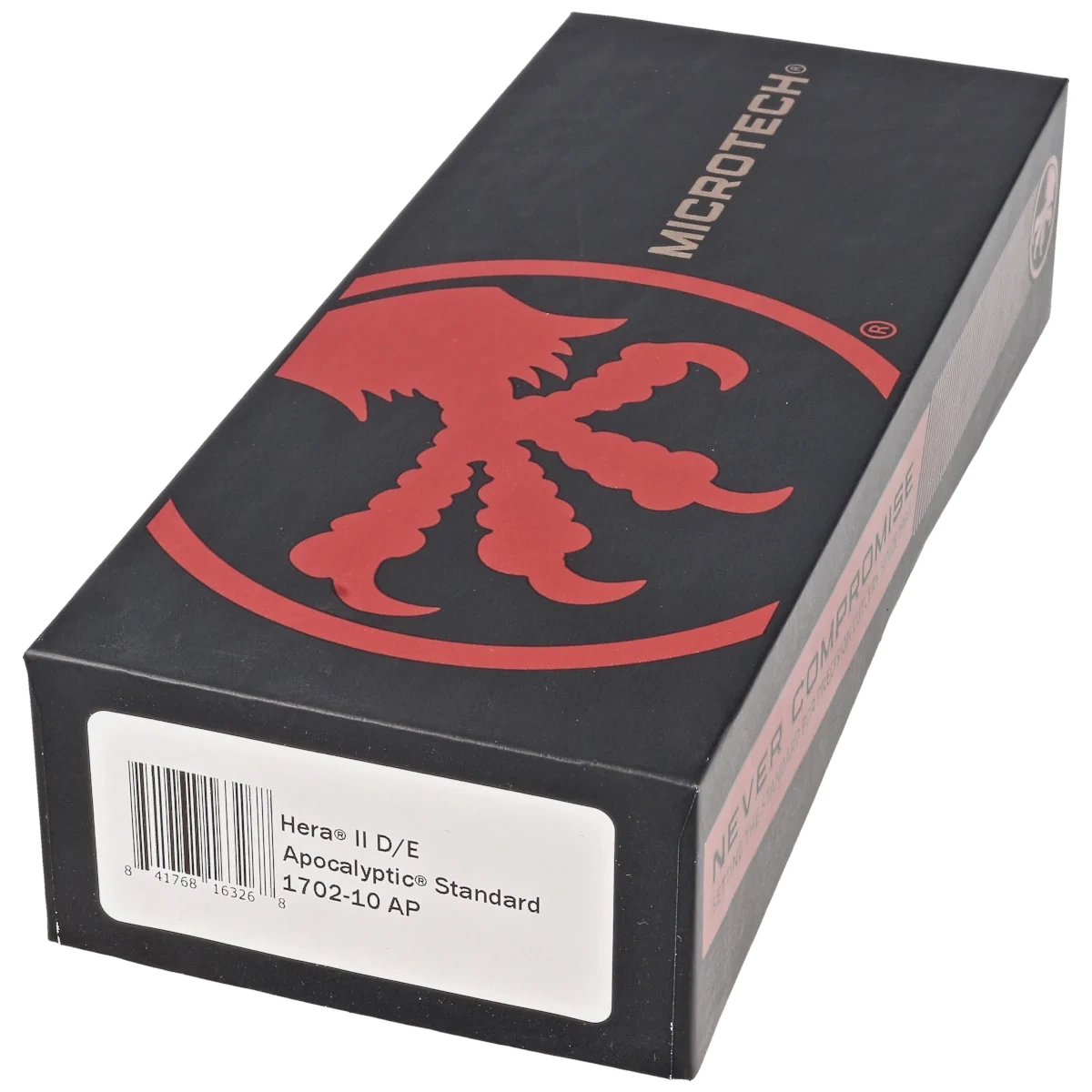 Hera II D/E Black Aluminum, Apocalyptic one of the most versatile OTF (Out The Front) automatic knives. Inspired by the iconic Troodon, it bridges the gap between EDC models and fully tactical designs. The exceptionally durable D/A (Double Action) mechanism provides fast, powerful, and reliable blade deployment and retraction. The knife stands out with its excellent fit, finish, and overall build quality. A design by Anthony Marfione, renowned knifemaker and owner of Microtech Knives.