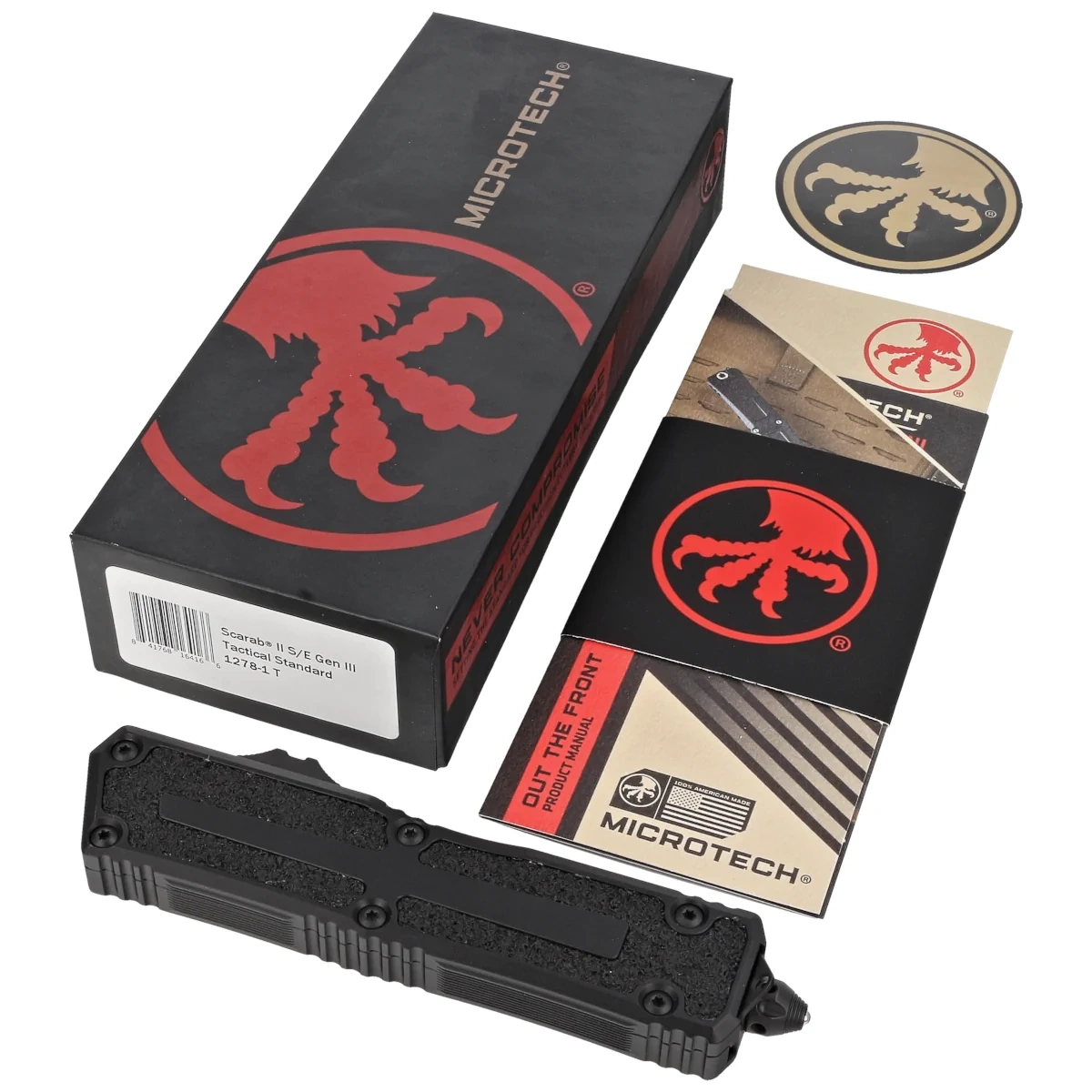 Scarab II S/E Gen III Black Aluminum/3M, Tactical featuring a tactical blade finish it represents the pinnacle of excellence among tactical automatic knives, taking inspiration from the original Microtech Ultratech design. Built to withstand the toughest conditions, the new Scarab II is the best choice for intense use. Retaining the stylistic features of its predecessor, it sets a new benchmark for OTF (Out The Front) technology.