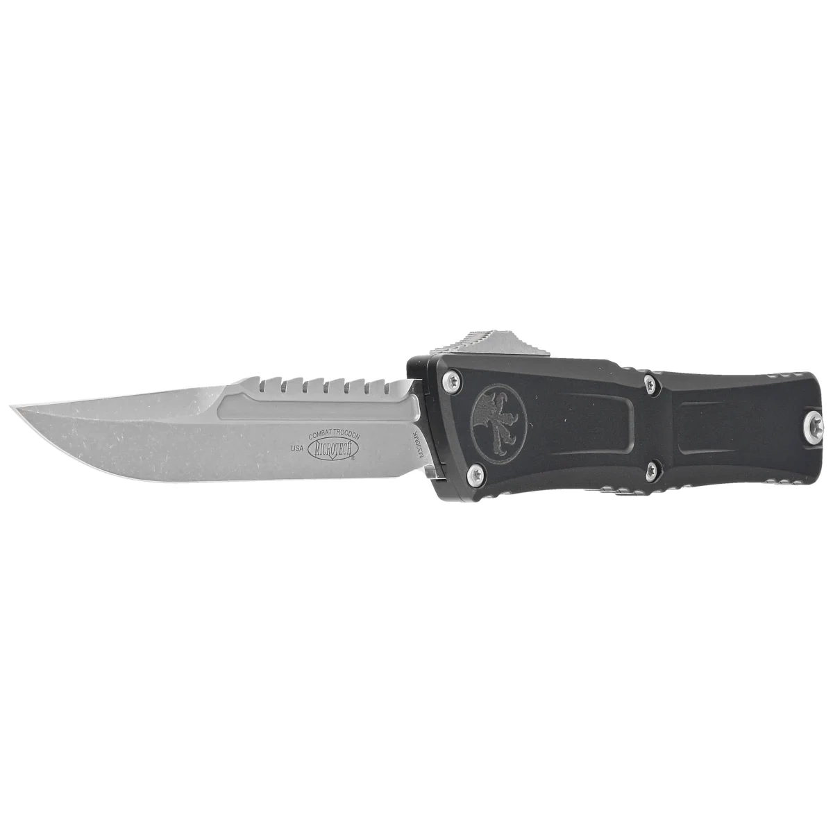 Combat Troodon Interceptor Gen III Signature Black Aluminum, Apocalyptic is the largest OTF (Out The Front) automatic knife in the Troodon series, built for a wide range of utility applications. Precisely crafted, it features a sophisticated and infernally fast mechanism that extends a razor-sharp new type of blade - the Interceptor. 100% made and assembled in the USA. Designed by Anthony Marfione, knifemaker and owner of Microtech Knives.