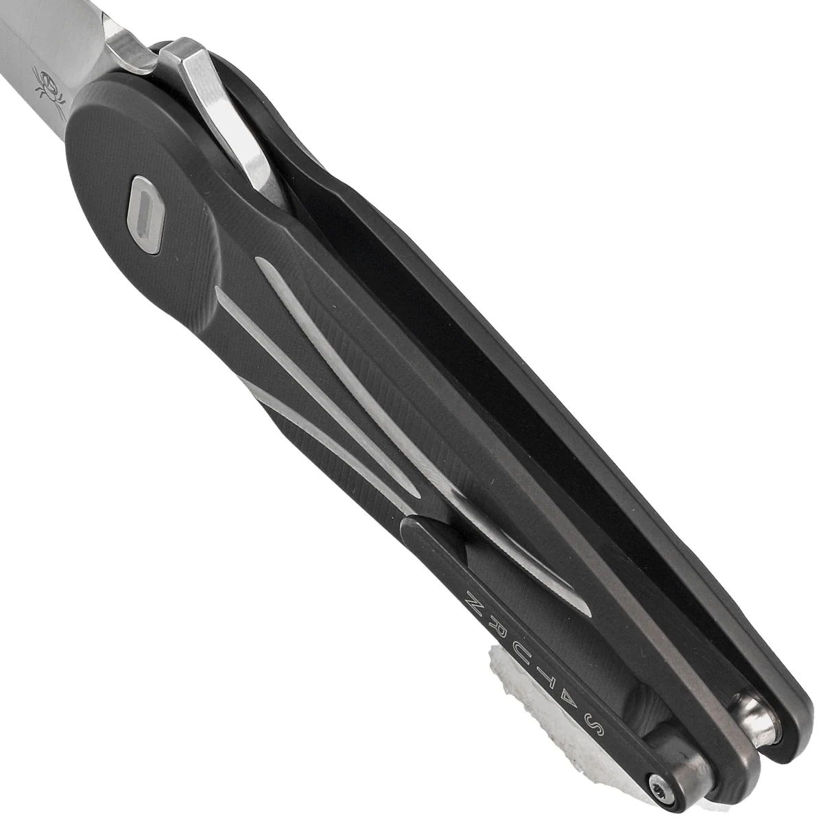 Handle - grips made of solid titanium, a very light and durable material. Twisted together using a spacer. Thanks to this design, the knife is very light, while maintaining high strength. The right-handed, single-position titanium deep-carry clip allows you to carry the knife discreetly in your pocket in tip-up (blade up) position. The sheaths and the clip are coated with black PVD.