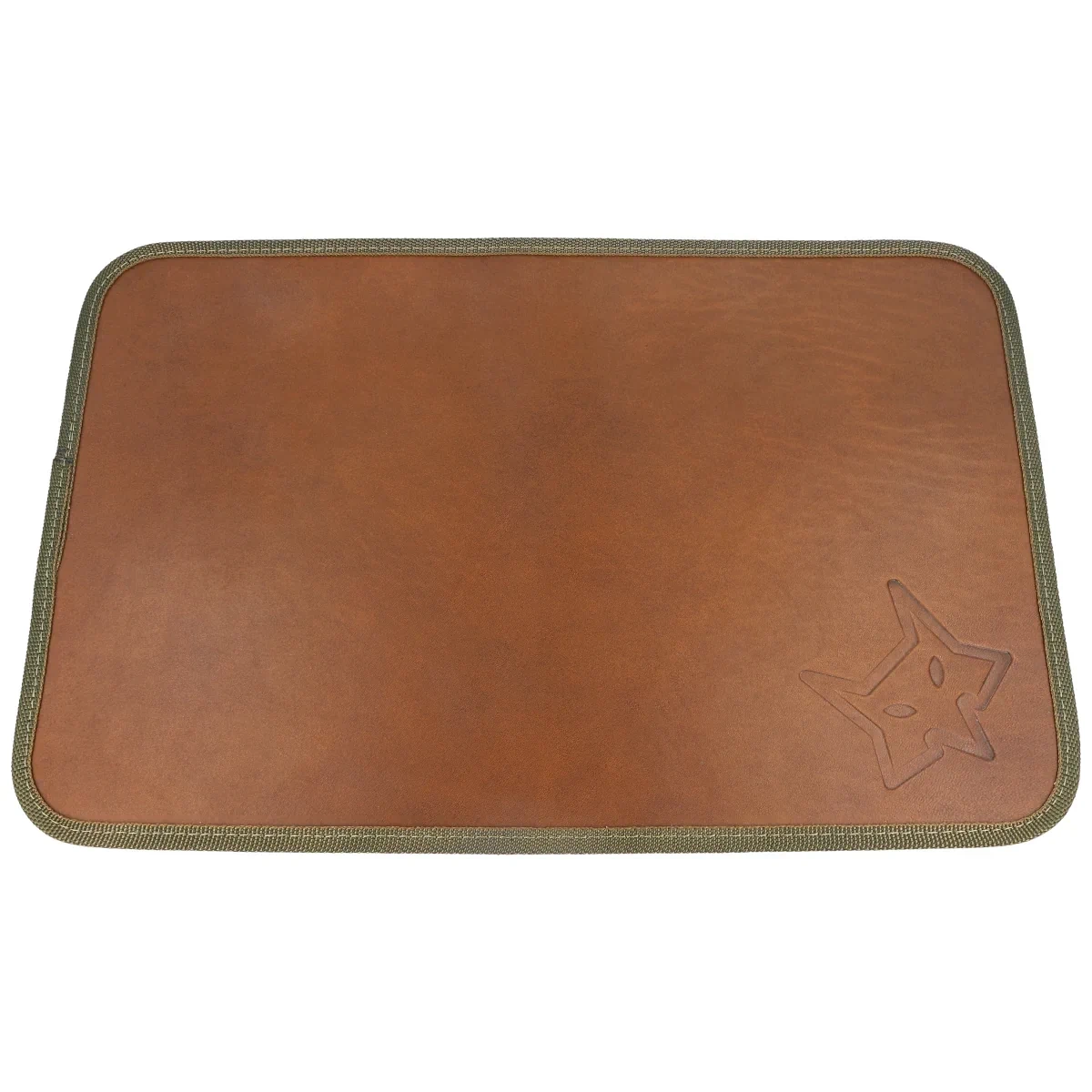 - Fox Green Leather Mat, a leather table or desk mat for displaying knives, the perfect accessory for stylishly showcasing your collection. Made of high-quality leather, the mat provides an elegant and durable surface for displaying your favorite knives.