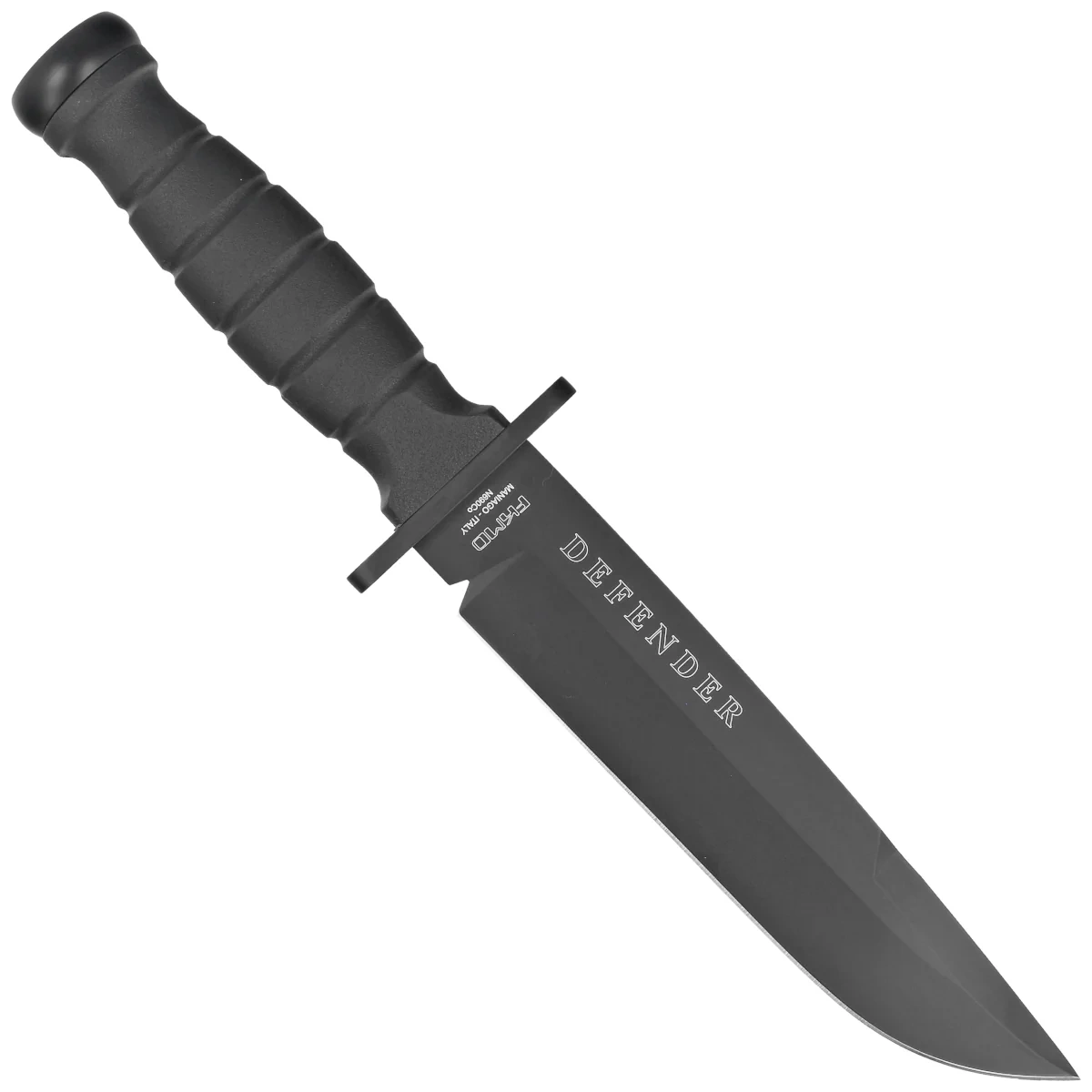 • Defender Black FRN, Black Top Shield, a large, sturdy knife inspired by the most common shape of a military assault knife. Robust Böhler N690Co steel blade, comfortable full-length FRN composite handle.