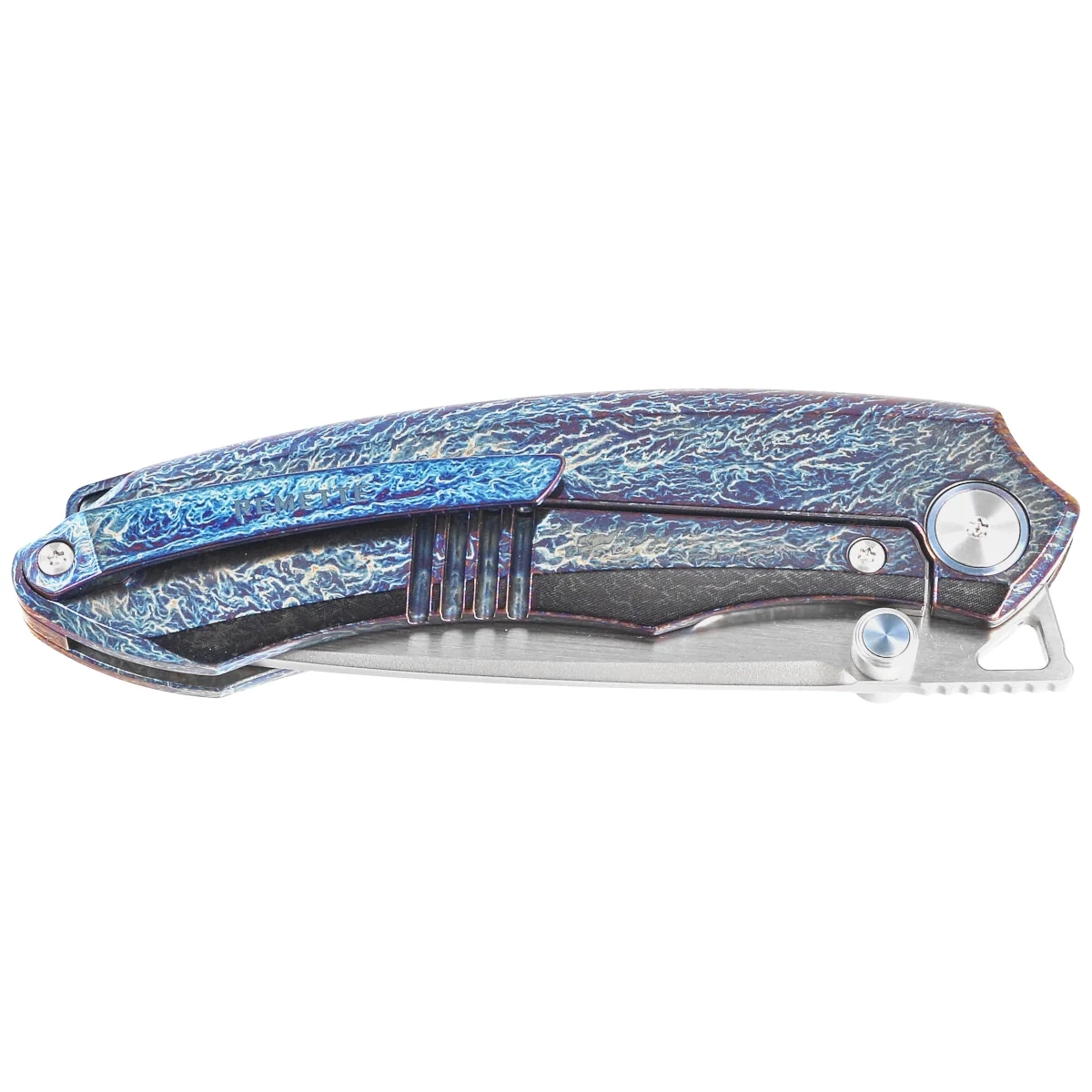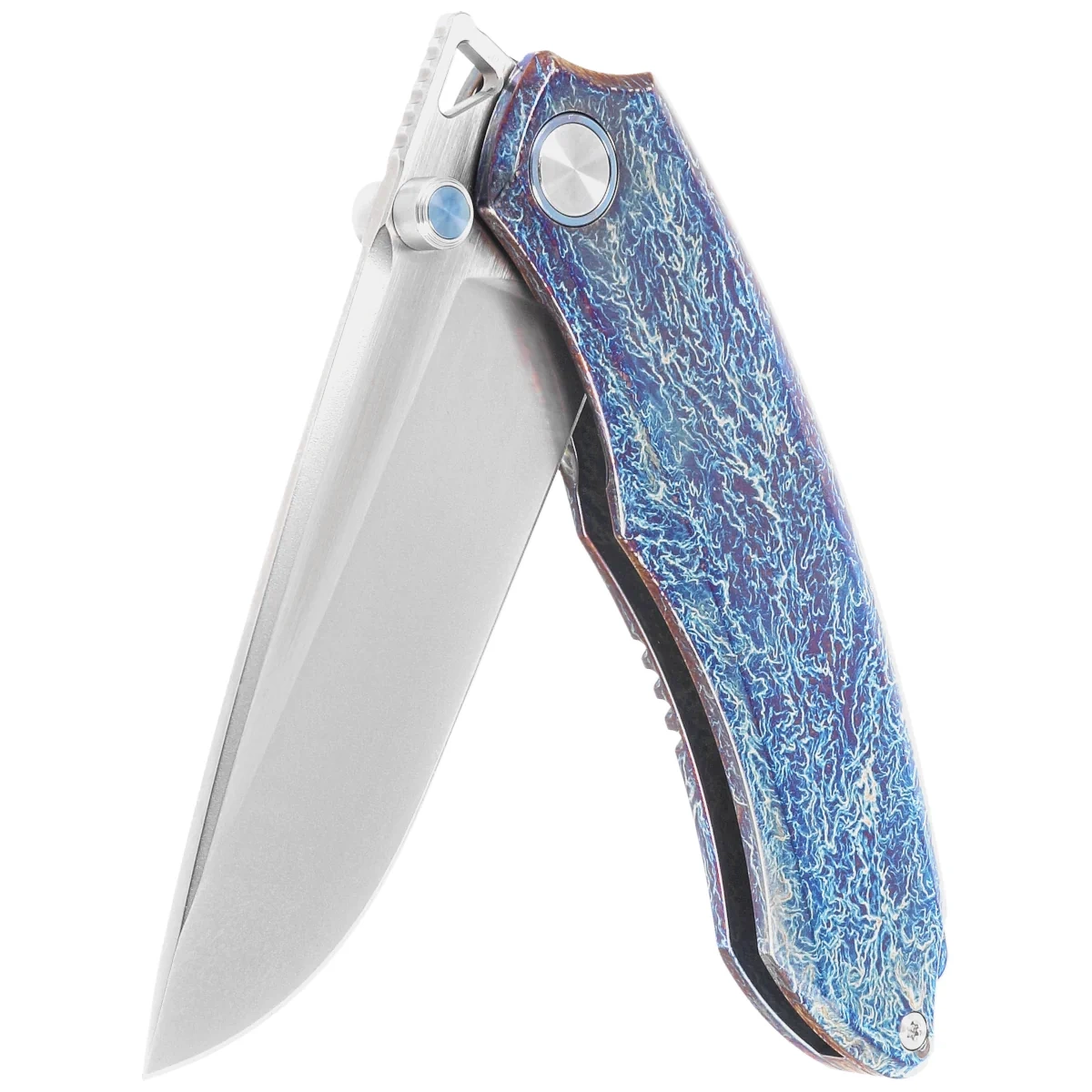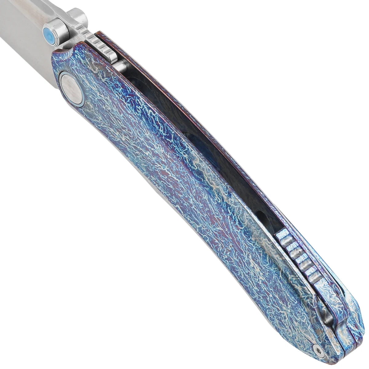 Handle - thick pieces of sandblasted 6AL4V heat-dyed titanium in Lightning Storm pattern, beautifully milled using CNC machine tools . The titanium backspacer to which the grips are attached guarantees the rigidity and strength of the entire structure. The simplicity and solidity of the construction give the assurance of many years of use. The single-position clip (right), made of titanium, allows the knife to be carried in tip-up position. The pivot axis is decorated with a rim made of dyed titanium (pivot collar cap). In the protruding part of the backspacer you will find a place for threading a safety or decorative cord.