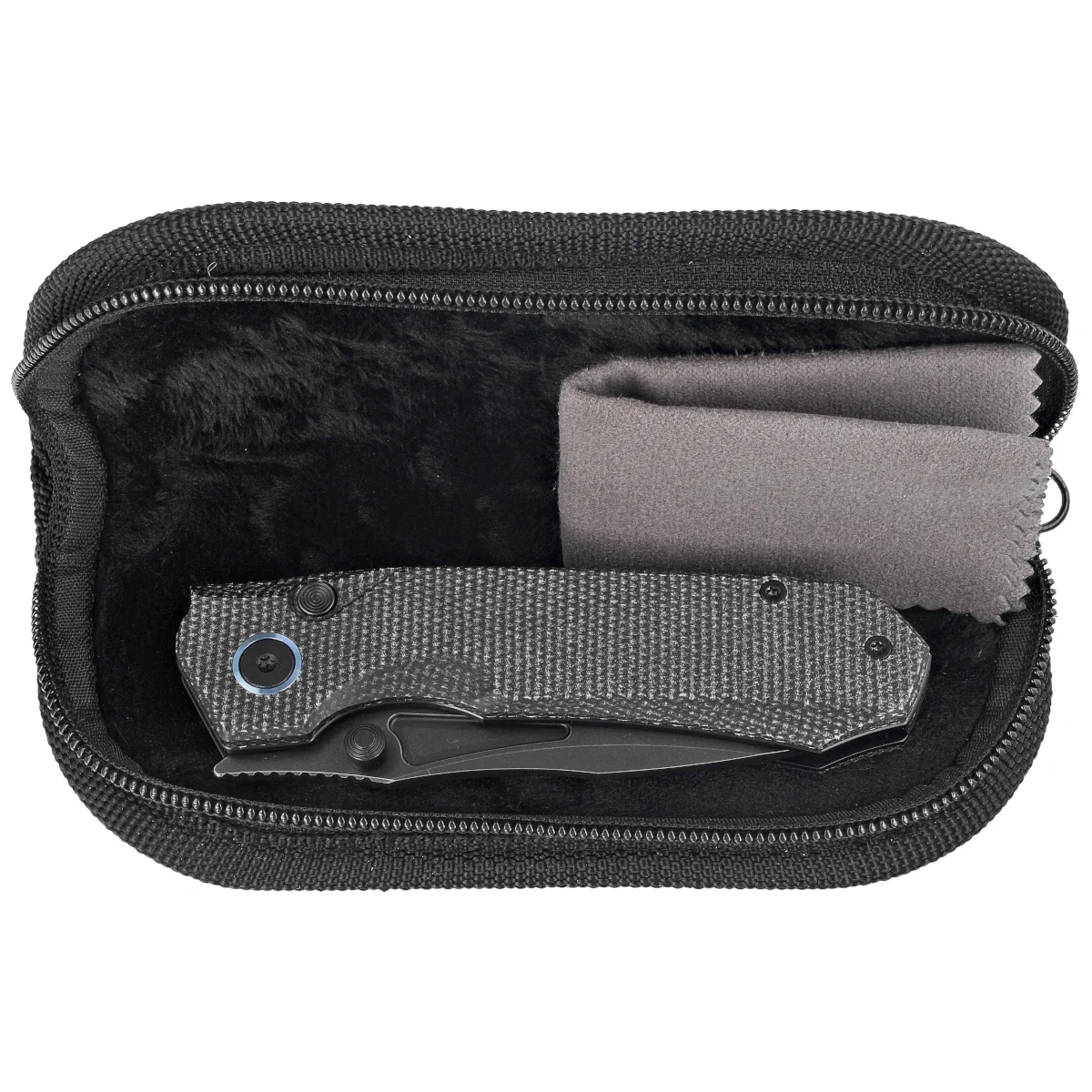 Blade - drop point type, coated with black titanium-based coating. The long cutting edge with a prominent belly, converges towards the needle-sharp tip of the wide wedge. The thickness of the blade provides high strength while the high, flat grind guarantees excellent cutting properties. Ceramic ball bearings are responsible for the smooth and smooth operation of the blade advancement mechanism. Afront flipper flipper for quick opening, the knife can also be opened using a double-sided peg in the wedge (Thumb Stud) or by gravity. On the back of the upper jimping wedge, notched thumb rest. Button Lock mechanism.