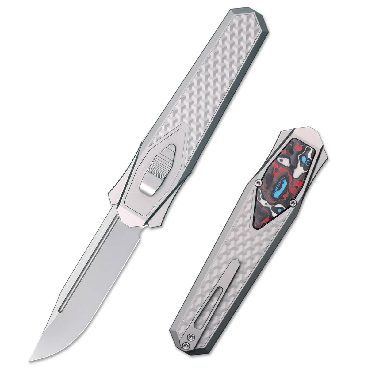 - Swordfish Titanium/Red Blue Carbon Fiber, Pearlescent. An innovative knife from the young Remette Knives manufactory. OTF with an extendable blade made of Böhler M390 steel by gravity. Handle made of titanium with an smart blade release system.