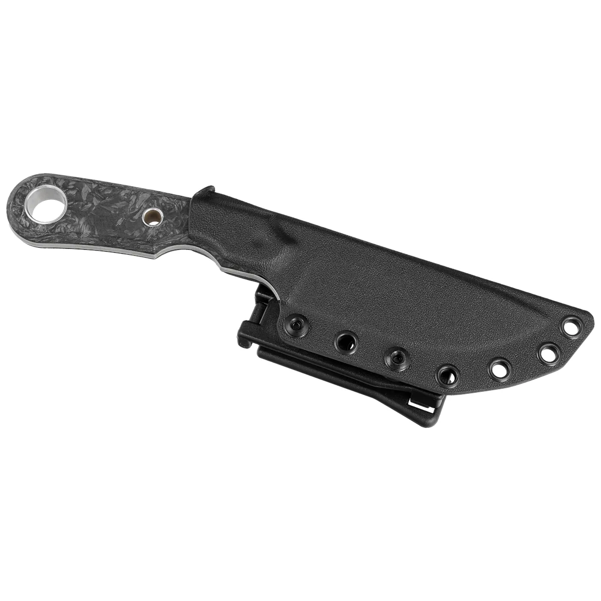 Handle - made of Dark Matter Carbon Fiber composite , riveted directly to the blade, provides virtually indestructible construction. The rounded shape of the covers eliminates sharp edges. The unique ergonomics of the Handle allows the knife to be held both ways, especially for users who appreciate an inverted grip. On the back of the Handle an enlarged lanyard hole, which is a hole for attaching a belaying line.