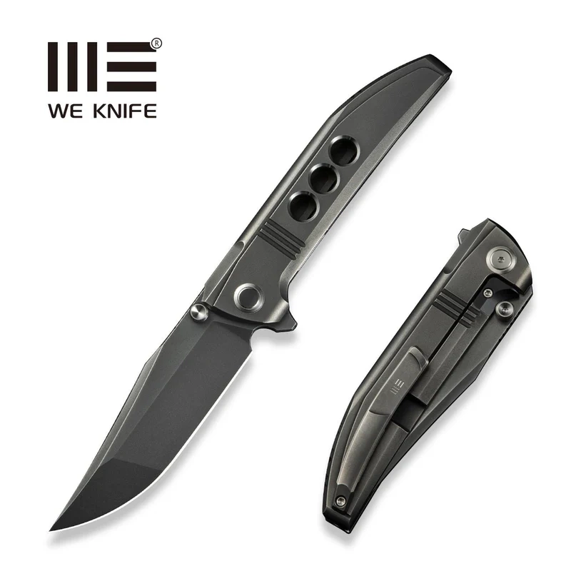 • Ezinta Polished Gray Titanium, Polished Gray large EDC folding knife from the WeKnife manufactory. Long clip point blade made of Böhler M390 steel, monolithic handle milled from a single block of titanium. Excellent whole-hand grip and two ways of opening