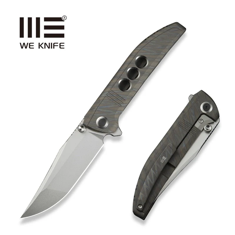 - Ezinta Tiger Stripe Titanium, Polished Bead Blasted, a large EDC folding knife from the WeKnife manufactory. Long clip point blade made of Böhler M390 steel, monolithic handle milled from a single block of titanium. Excellent grip and two ways of opening