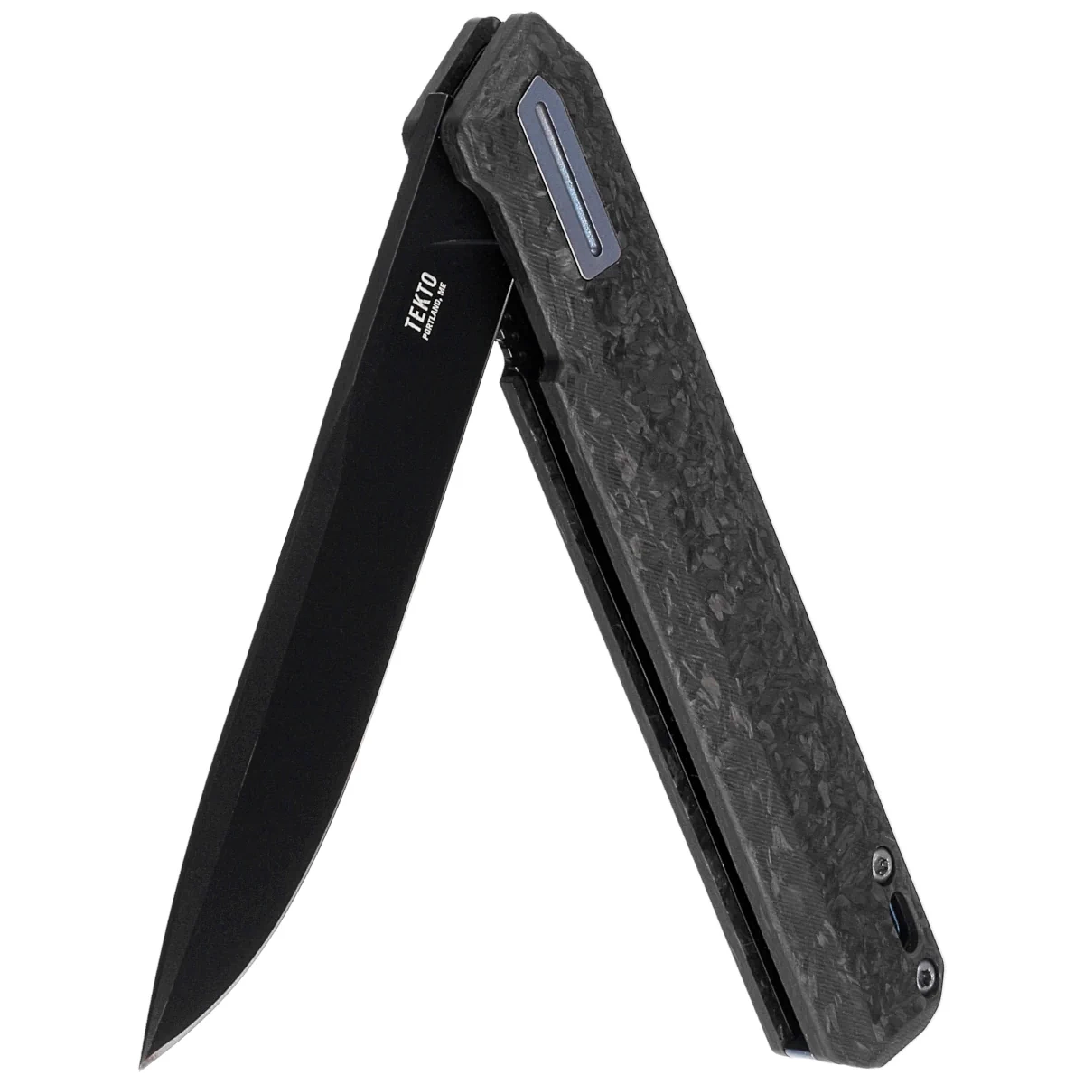 • F2 Bravo Black Forged Carbon Fiber, Blue HW/Clip, Black compact folding knife from Tekto Knives. Utilitarian blade made of D2 tool steel, solid Carbon Fiber composite grips. Lightweight and durable, you can carry it comfortably in the included pouch.