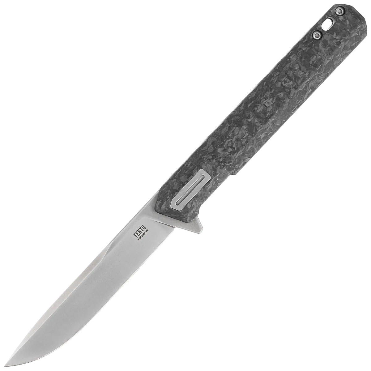 - F2 Bravo Black Forged Carbon Fiber, Silver HW/Clip, Satin compact folding knife from Tekto Knives. Utilitarian blade made of D2 tool steel, solid Carbon Fiber composite grips. Lightweight and durable, you can carry it comfortably in the included pouch.