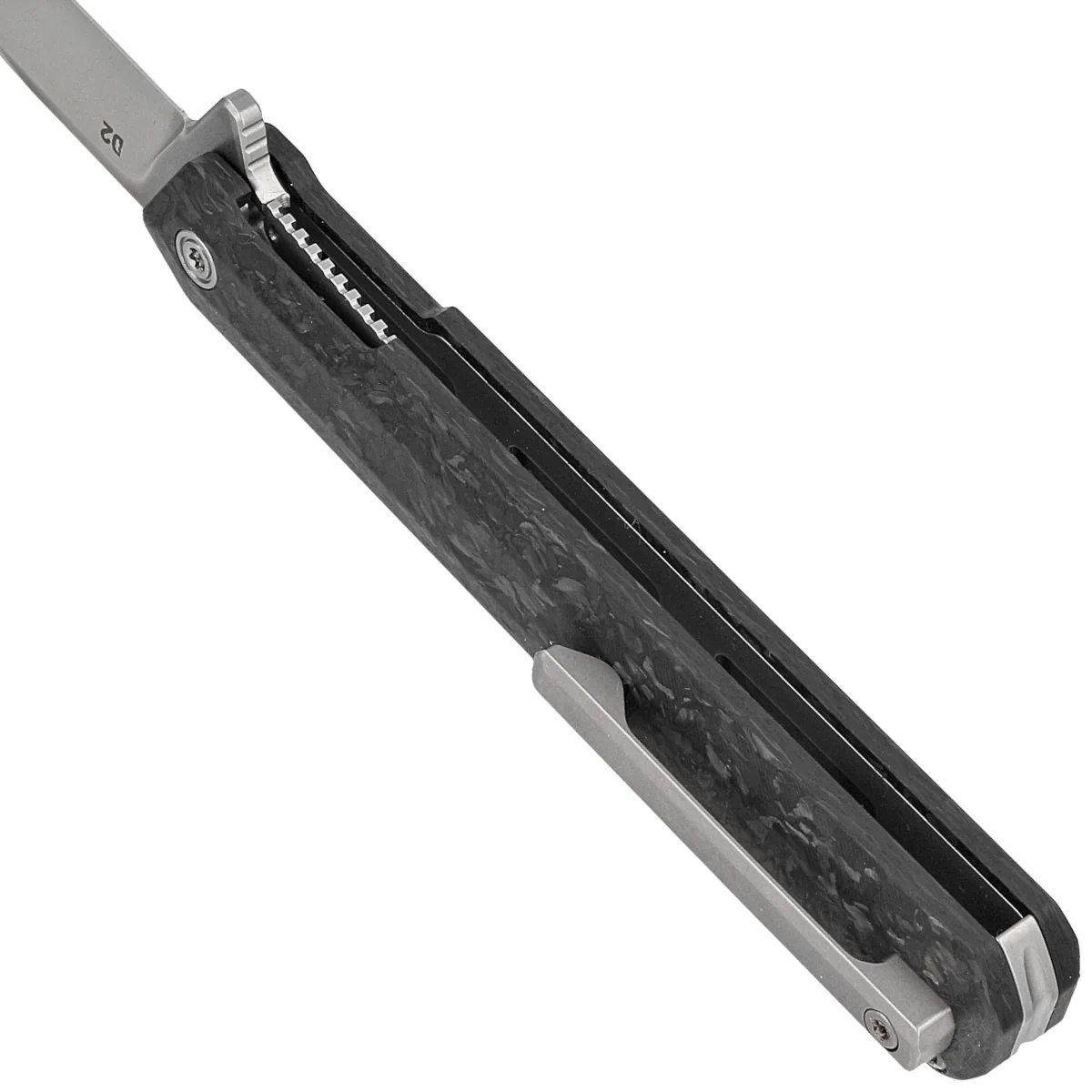 F2 Bravo Black Forged Carbon Fiber, Silver HW/Clip, Satin is more than just a knife. It's a tool that was designed for the most demanding users who need a lightweight helper. Made of good materials, it features unmatched durability and is ready for any challenge. Its design is the result of long-term research and testing to create a tool that is optimal in terms of functionality and durability. The blade is made of high-quality D2 tool steel, which is known for its durability and long sharpness retention. The Handle of the knife is made of Forged Carbon Fiber composite for lightness and strength. The surface texture and notches on the Handle ensure a secure grip even in the toughest conditions. This is not only a tool, but also a symbol of reliability and durability. This is a knife that will survive anything. Whether you are an advanced or casual user, this knife is sure to meet your expectations.