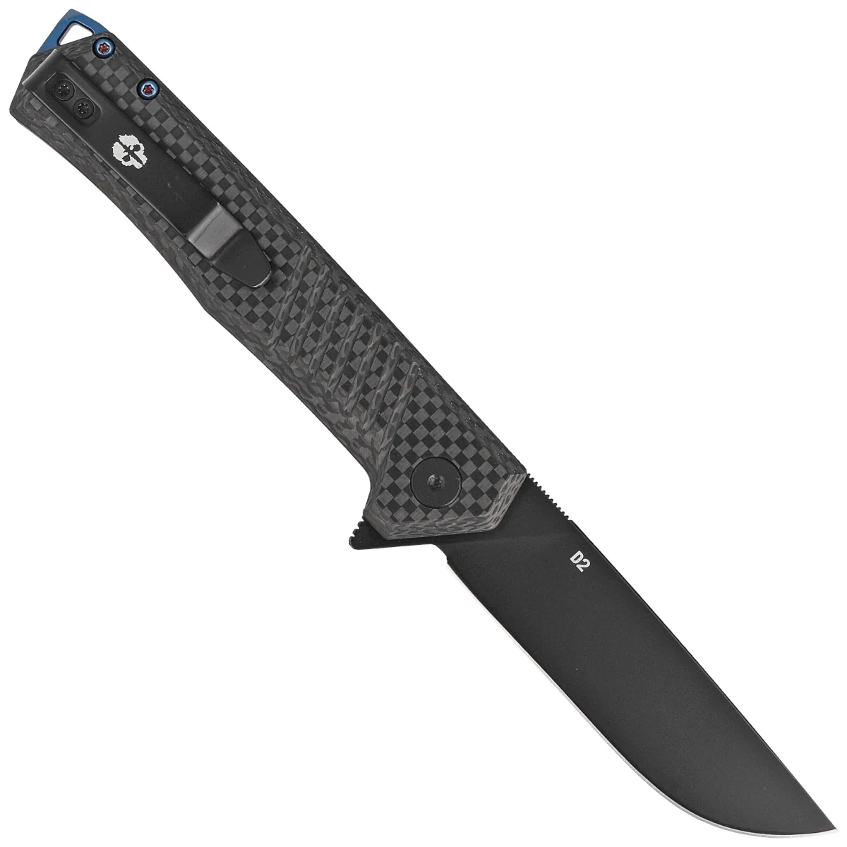 - F1 Alpha Black Carbon Fiber, Blue HW, Black universal folding knife from Tekto Knives. Utilitarian blade made of D2 tool steel, solid Carbon Fiber composite grips. It will work well on the battlefield, in the woods, camping or in the workshop.