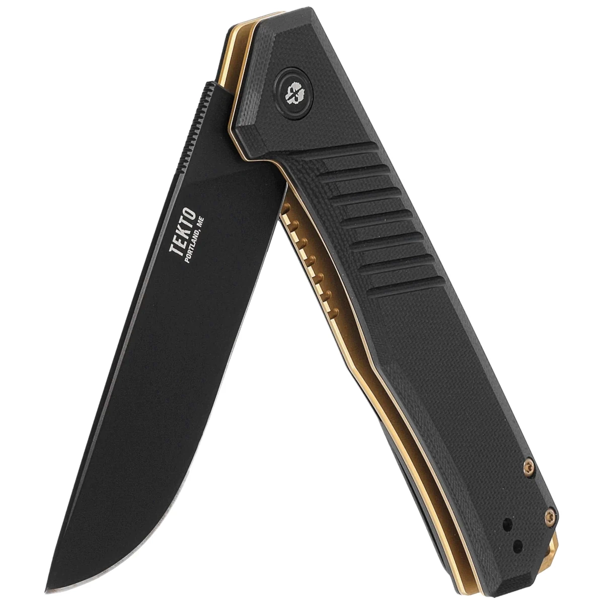 • F1 Alpha Black G10, Bronze HW, Black universal folding knife by Tekto for those who demand reliability. The utilitarian blade is made from D2 tool steel, with durable G10 composite scales. Ideal for the battlefield, forest, camping, or as an EDC.