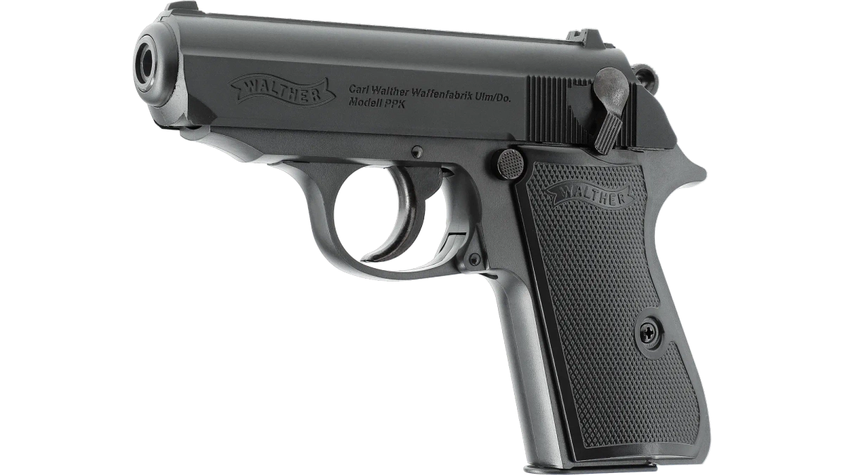 The Walther PPK/S 6 mm model is equipped with a manual safety that locks the trigger mechanism, preventing accidental shots. This feature ensures safe play and transport.